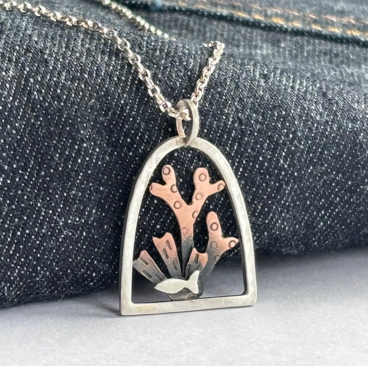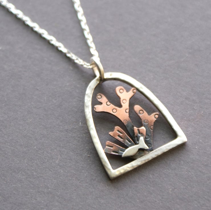 A gorgeous silver and copper necklace featuring an underwater scene with a little silver fish amongst some copper seaweed within a sterling silver arch. The metal has been textured, oxidised and rubbed back for depth. The circle is hammered for extra interest. The pendant is hung from an 18 inch sterling silver chain. (other lengths available, please ask)