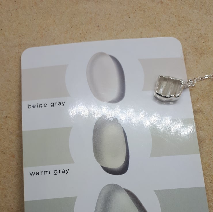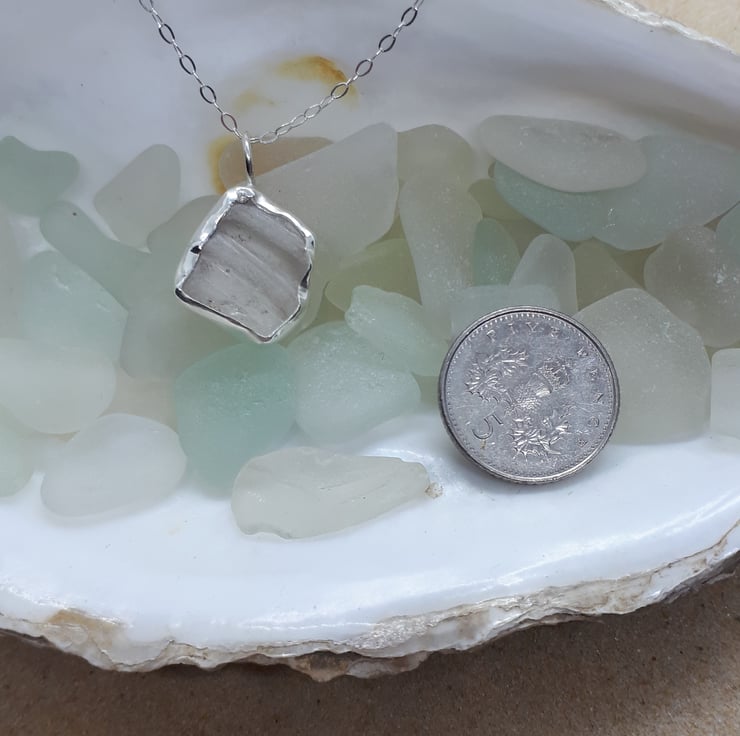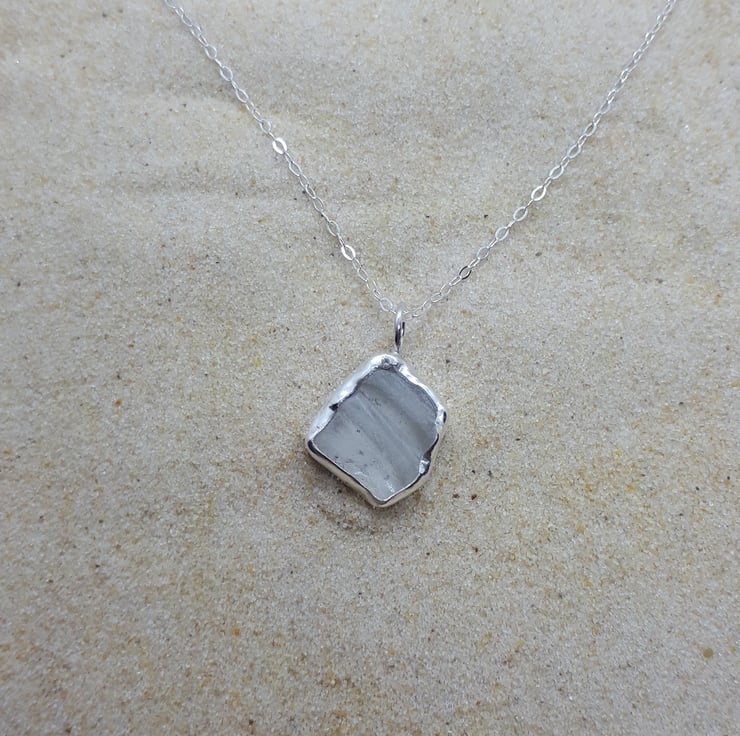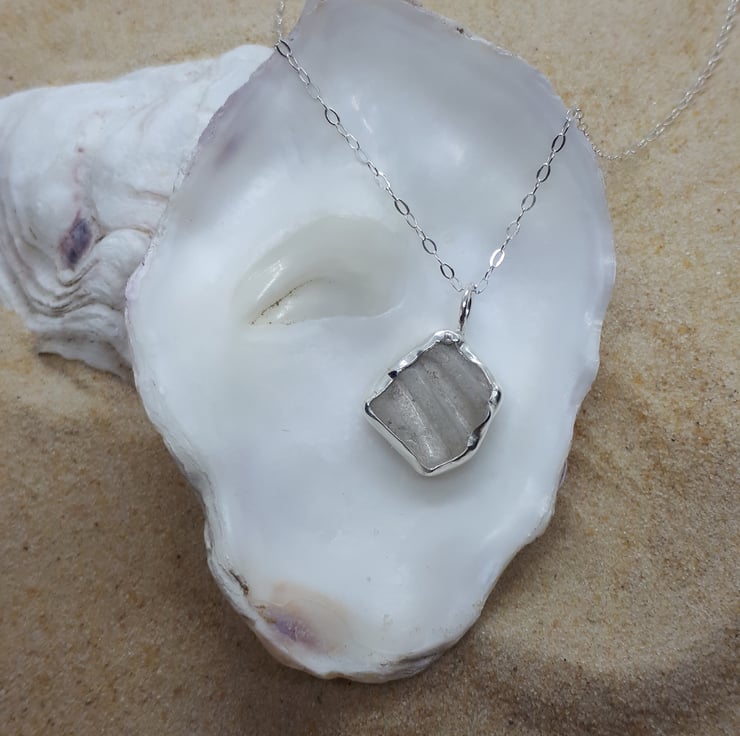 A genuine piece of UK sea glass (beige grey) set in fine and sterling silver, hung on an 18 inch sterling silver trace chain.