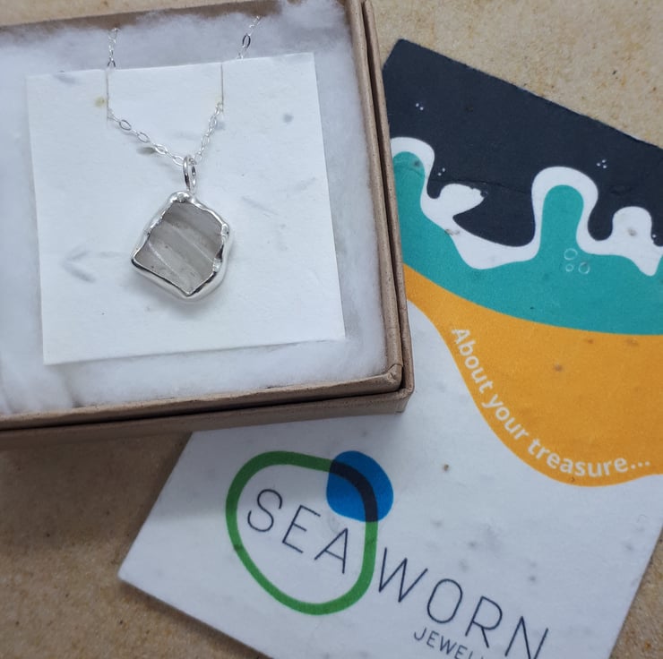 Any marks in the sea glass are from its weathering in the sea, which is part of its history and any small imperfections in the silver are where it is hugging the unique shape of the sea glass. Due to the nature of sea glass and the varying thickness of the glass, it will look different shades in different lights, which is all part of its magic.