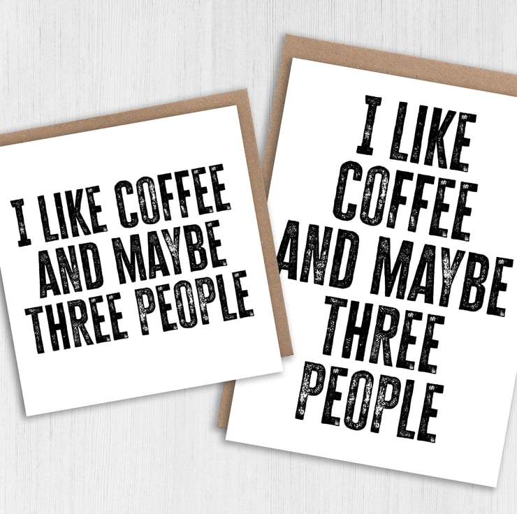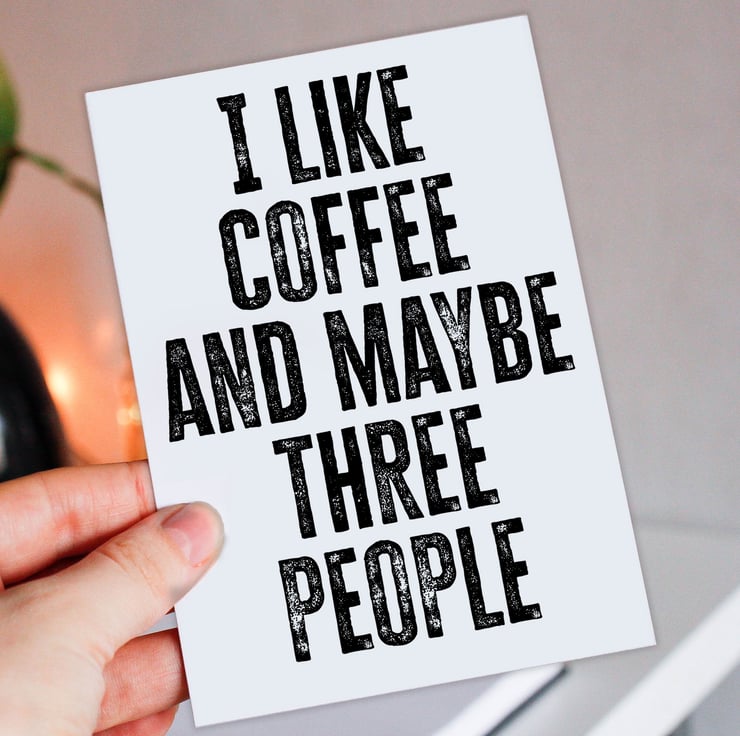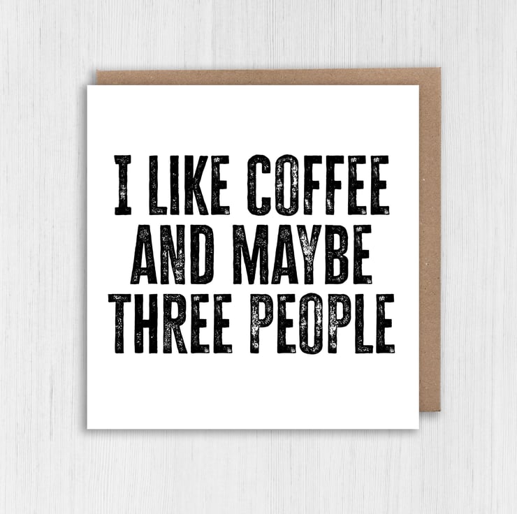 Funny coffee-themed, coffee drinker, caffeine addict birthday card: I like coffee and maybe three people (Size A6/A5/A4/Square 6x6")