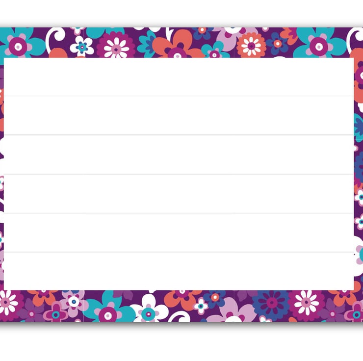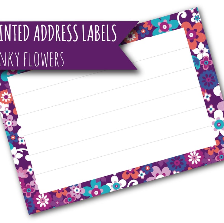 A pack of 10 x self-adhesive address labels with a retro purple flowers themed border. Handmade by me on a digital printing press.
