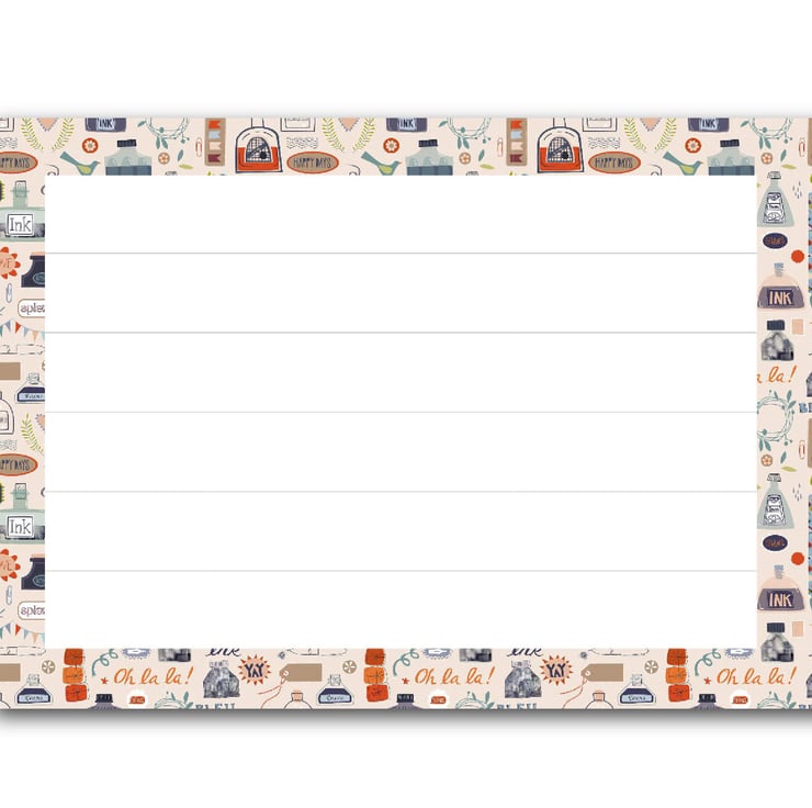 A pack of 10 x self-adhesive address labels with a cute ink bottle themed border. Handmade by me on a digital printing press.