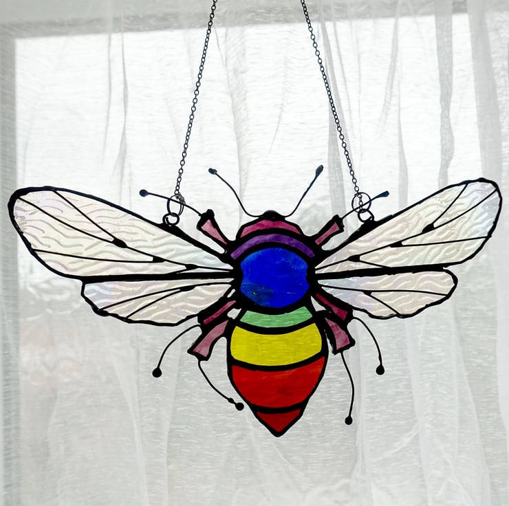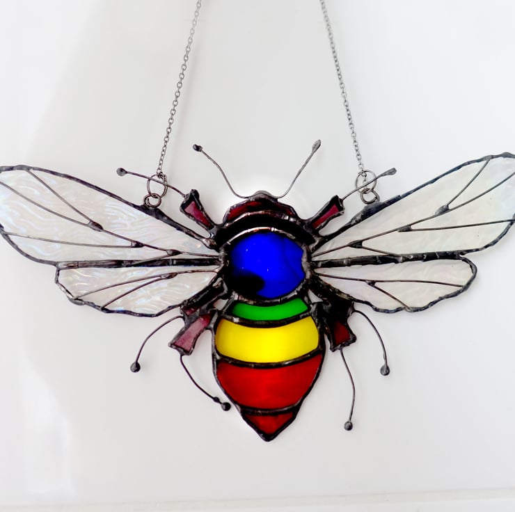 This lovely bee is made from rainbow stained glass and hangs from a slim strong chain. The wings are made from glittering textured rainbow iridescent glass with copper veining, and the main body is made rainbow shades.