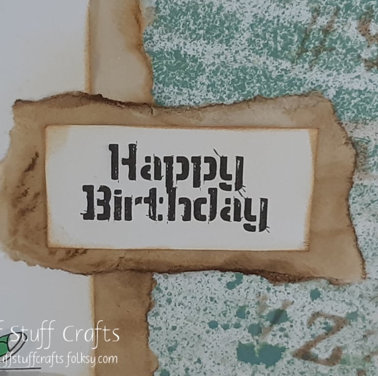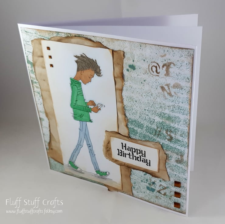 Square birthday card in a grungy style, featuring a hand coloured image of a teenage boy on his mobile phone. The image and printed sentiment 'Happy Birthday' have been mounted onto ripped, coffee dyed paper, over a stencilled background of bricks, with random letter and symbols. The card is embellished with small square gems.