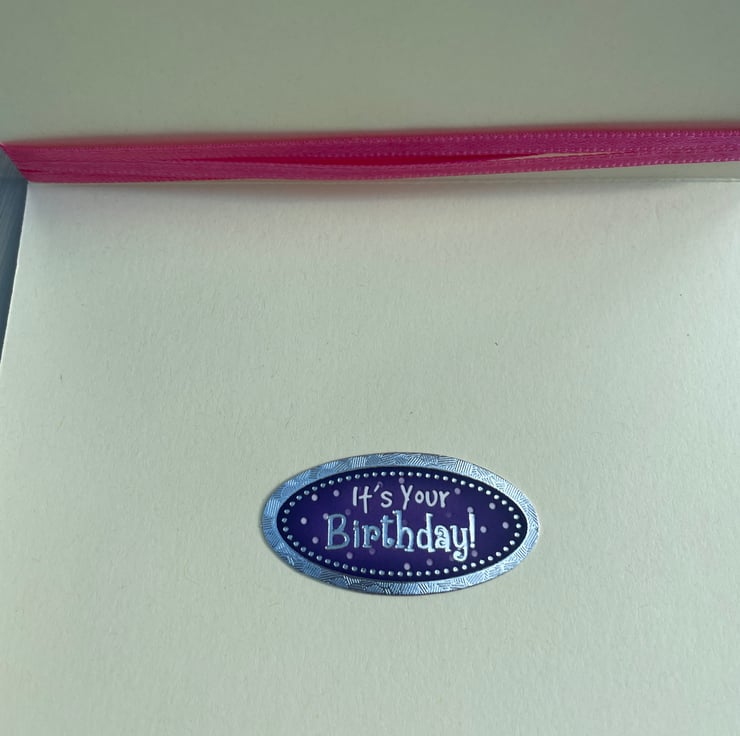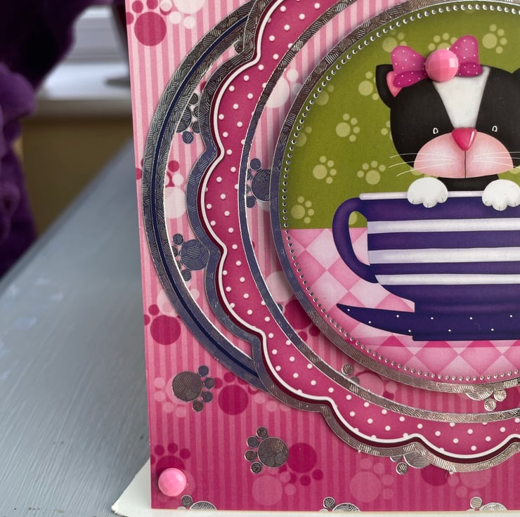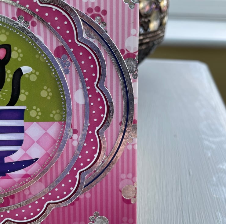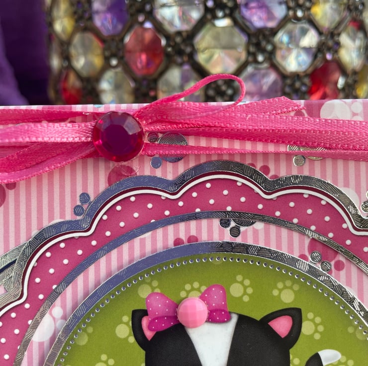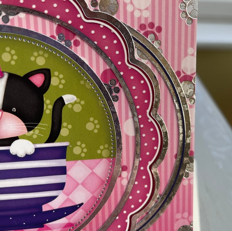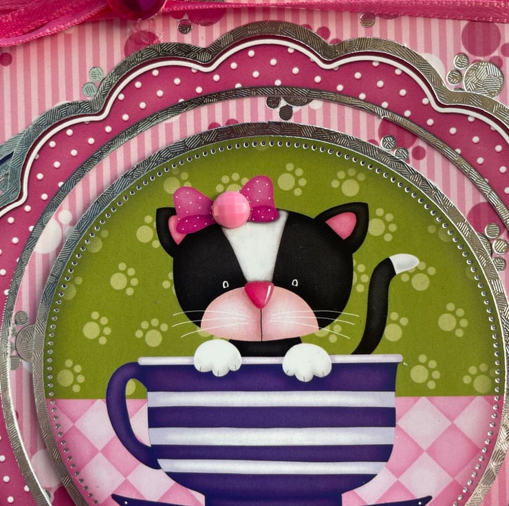 A pink and fabulous card for a special persons birthday. This card 13.5x13.5cm card is a riot of pinks. The card has a pink ombre coloured striped base with silver, pink and white paw prints. This is topped with a pink polka dot scalloped frame around the main design. This features a cute black and white kitty sitting in a teacup. Dhe has a pink bow in her hair. The design is finished off with a fine satin ribbon wrapped aroud the card, tied in a bow and finished with a pink gem. the corners and cats bow have a mat pink gem embellishment. Inside the card has the greeting It's your birthday.