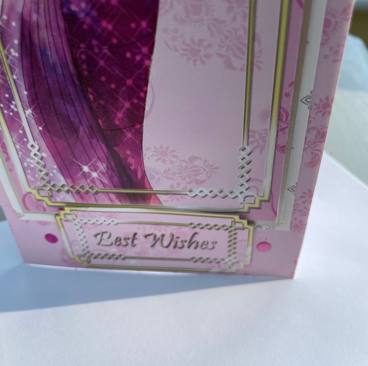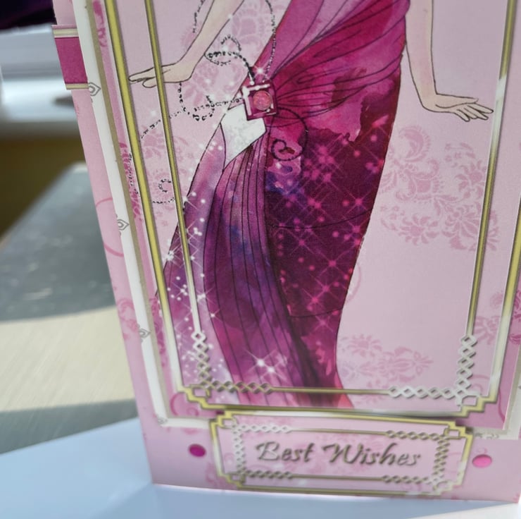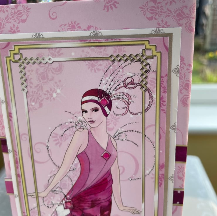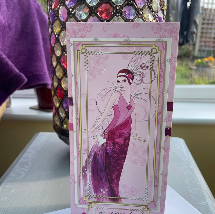 An elegant figure of an Art Deco lady resplendant in a beautiful long dress. This DL sized card is all delicate pinks. The background paper has a delicate floral design. This si topped with a white and grey paper with a repeating design. The main design has a lady dressed in a long pink gown and wearing a cloche hat. She is surrounded with swirls and an art deco frame. There is a matching greeting that says Best wishes and the design is finished with some faux gems. The greeting inside the card says With love in a matching style.