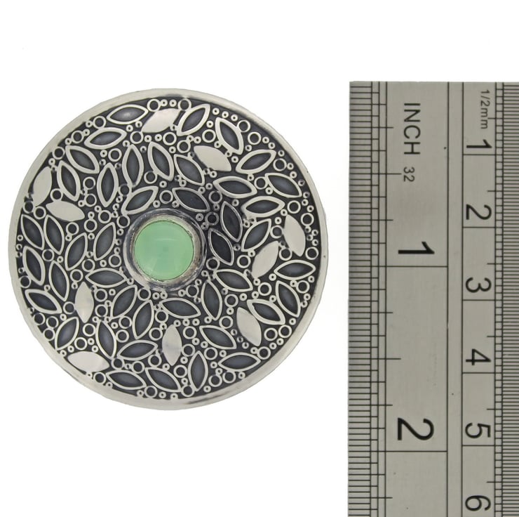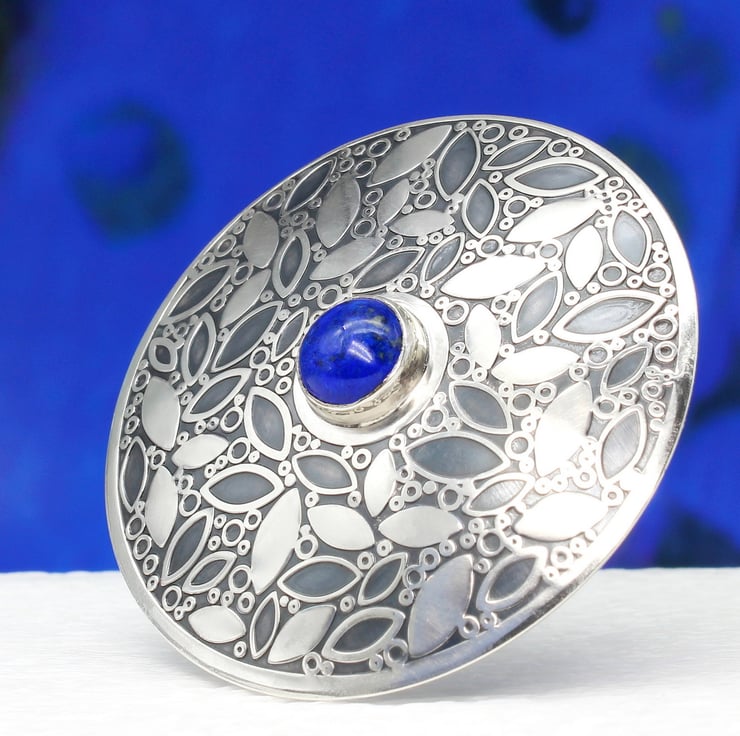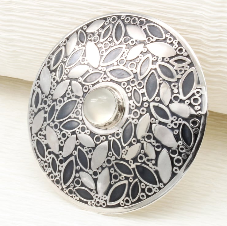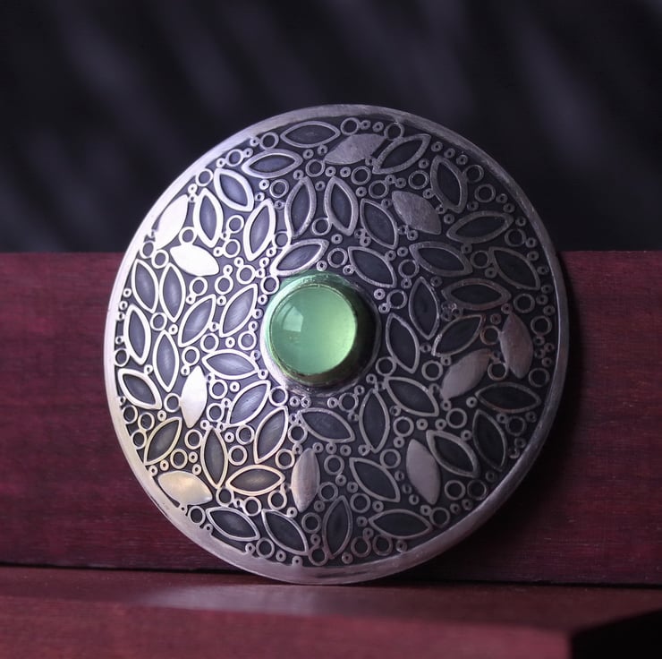 The inspiration for this brooch comes from nature. The leaf and berry pattern has been designed by us and embossed into sterling silver to create a beautiful surface pattern. The brooch is slightly domed, measures 45mm in diameter and features a beautiful 8mm Amethyst gemstone set in a silver bezel. Our makers mark 'J&DF' and a '925' sterling silver mark have been punched into the silver on the back of the brooch.