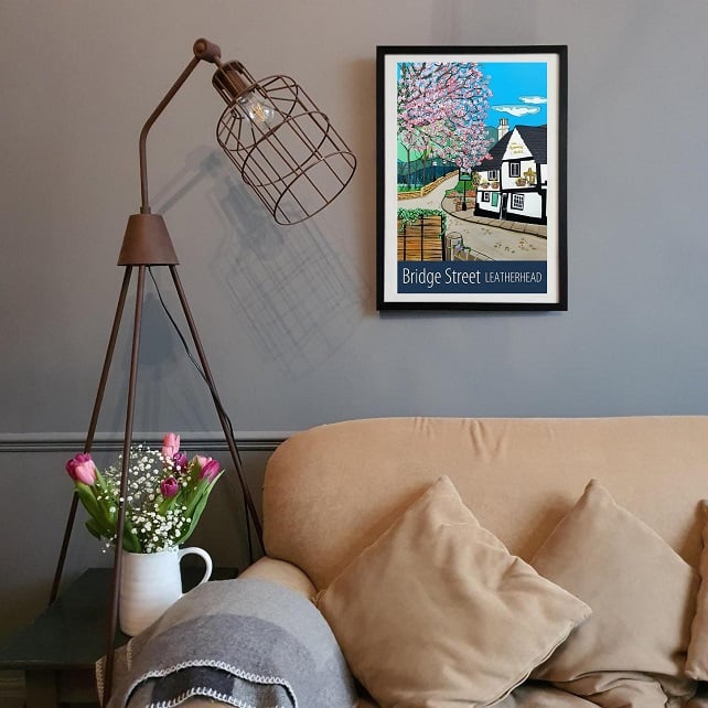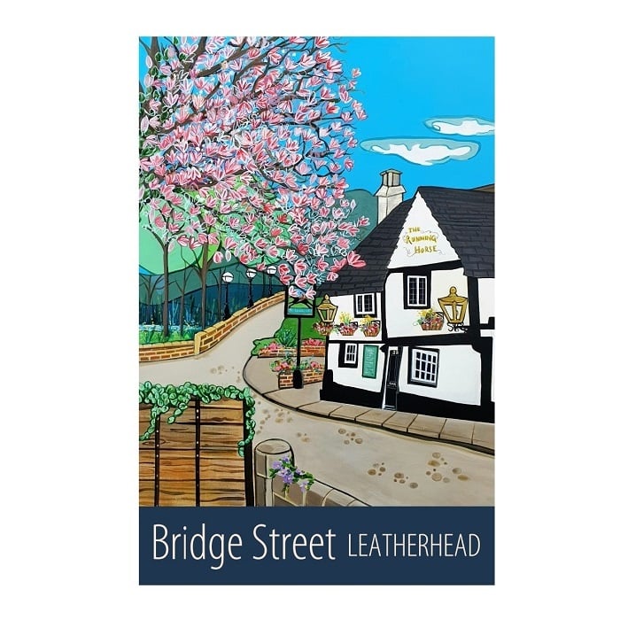A contemporary travel poster style print of the view down Bridge Street, Leatherhead, and the historic Running Horse pub, from my own original acrylic painting.