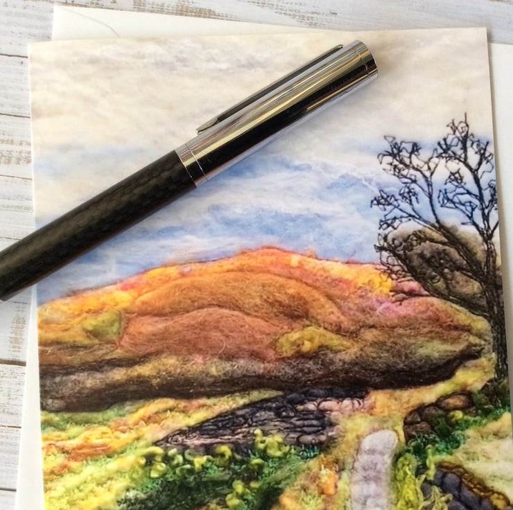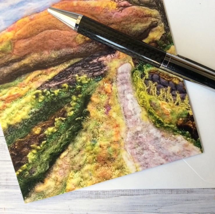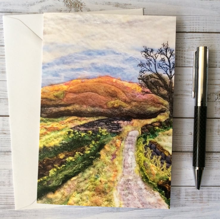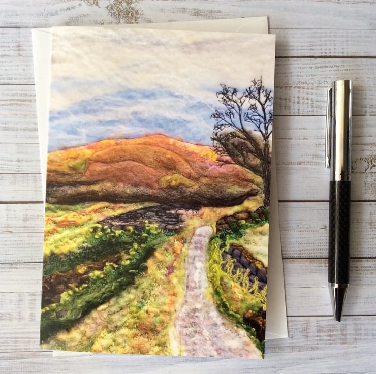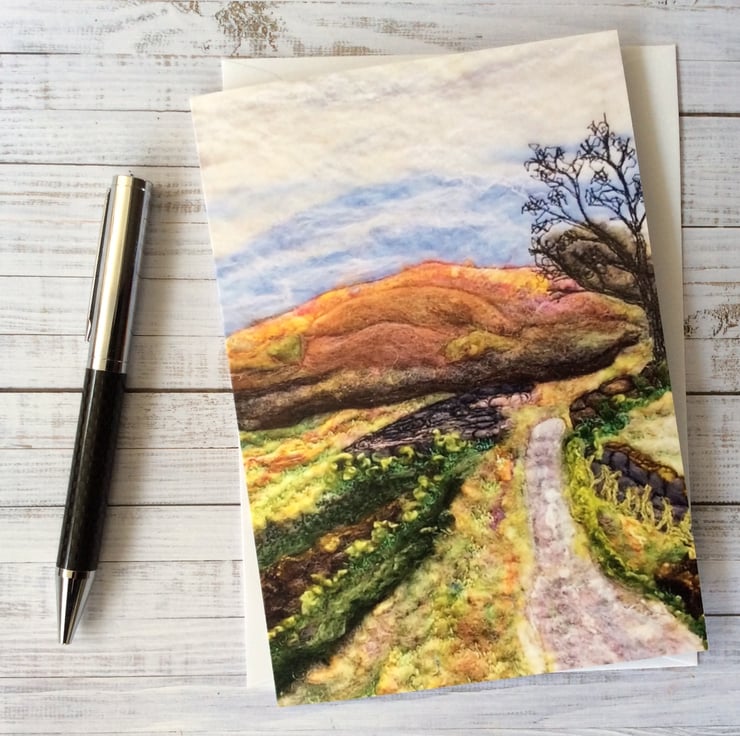 This card is a print of one of my wet felting landscapes with free motion embroidery. This one shows Baildon Moor from the village where I live. It’s ideal for any occasion. The card measures 12.5 x 18cm and it comes with a white envelop in a plastic cover for protection.