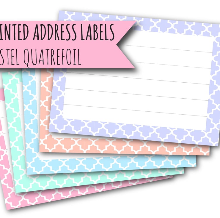 A pack of 10 x self-adhesive address labels with a pastel quatrefoil themed border. Handmade by me on a digital printing press. There are 5 different colours in the pack, so you will receive 2 of each colour.