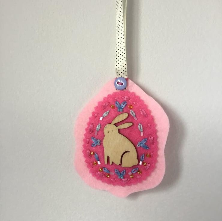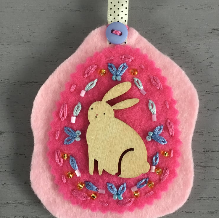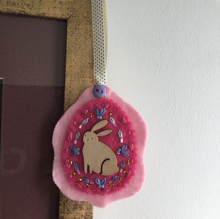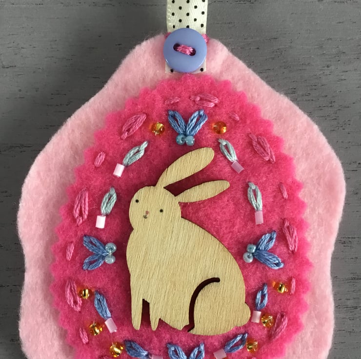 This Hand Embroidered Pink Rabbit Decoration has a wooden Rabbit motif, surrounded by hand embroidered Lazy-Daisy and Running Stitches in pale blue and pink embroidery threads, dotted with golden, pale pink and blue seed beads. She sits on ovals of rose and pink felt, secured with a long cream ribbon, stitched with small blue buttons front and back.