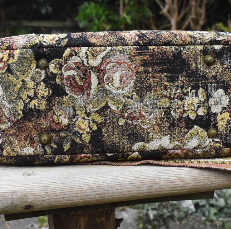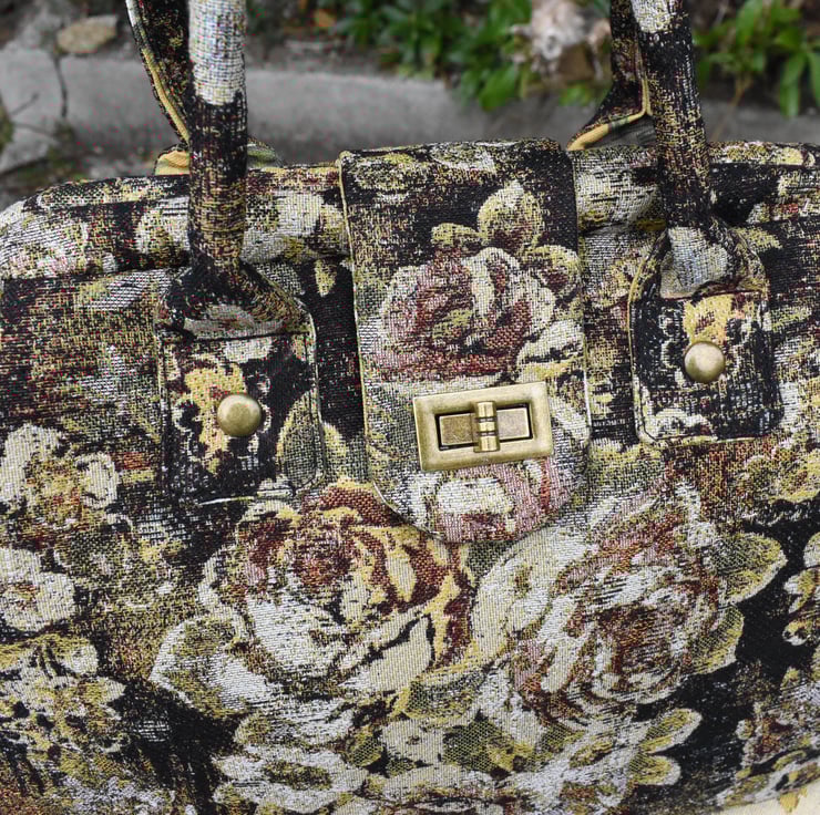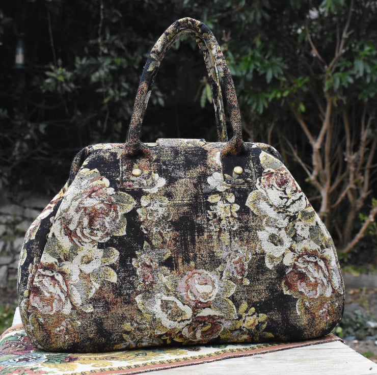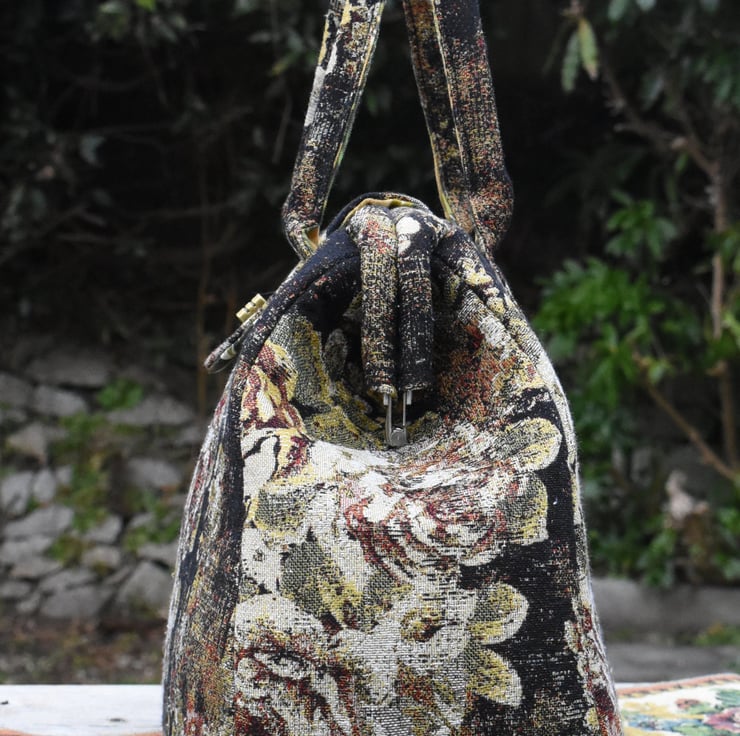 Mary Poppins Victorian style, distressed look Gladstone carpet bag in a black with faded roses woven fabric and an ochre and green tropical monkey print cotton canvas.