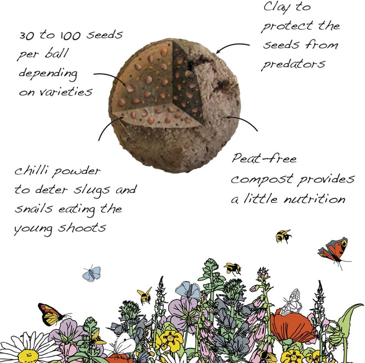 Each box contains six wildflower seed balls - made from a mix of British wildflower seeds, peat-free compost, clay and chilli powder, which together works to naturally protect the seeds from being eaten before they've had a chance to grow. Simple to use and works well in pots and window-boxes as well as in garden beds. All you need is a patch of soil or compost and some rain.