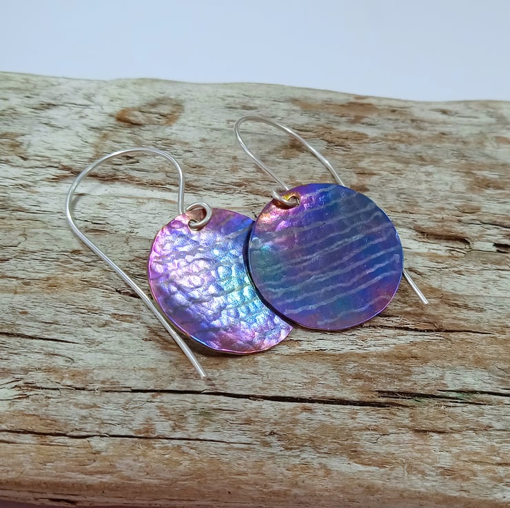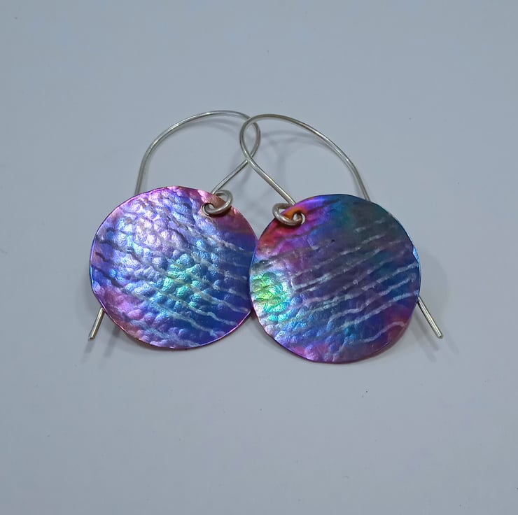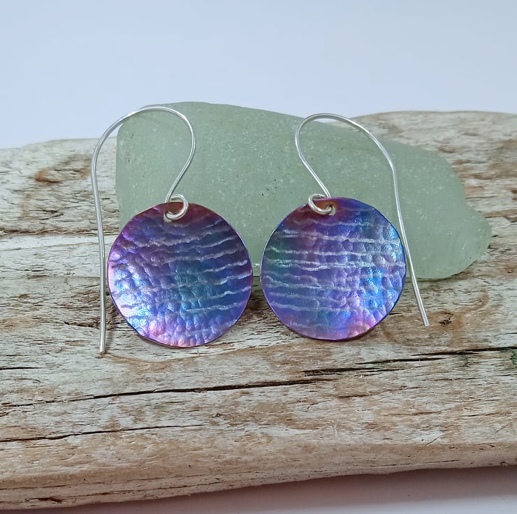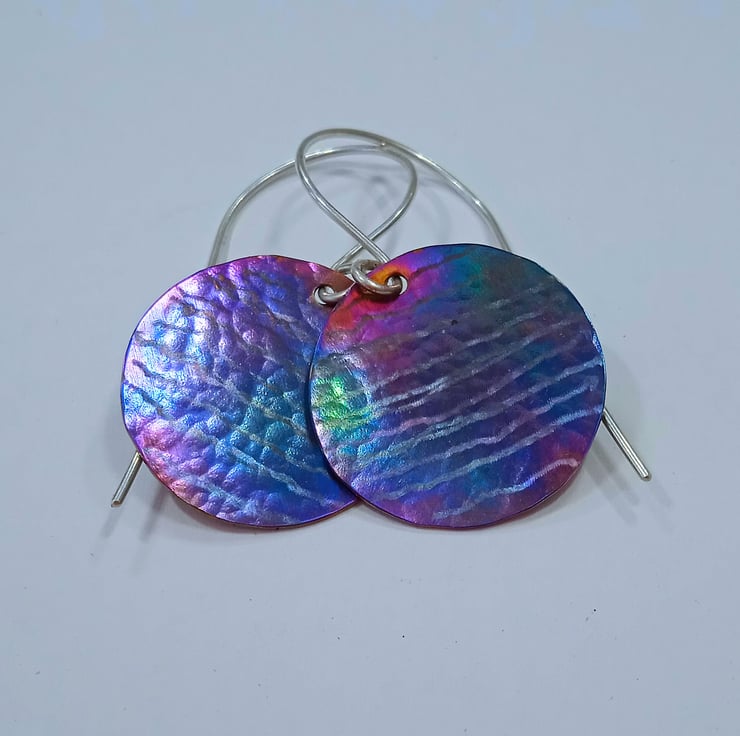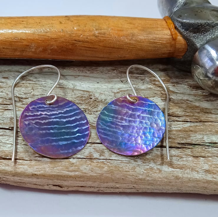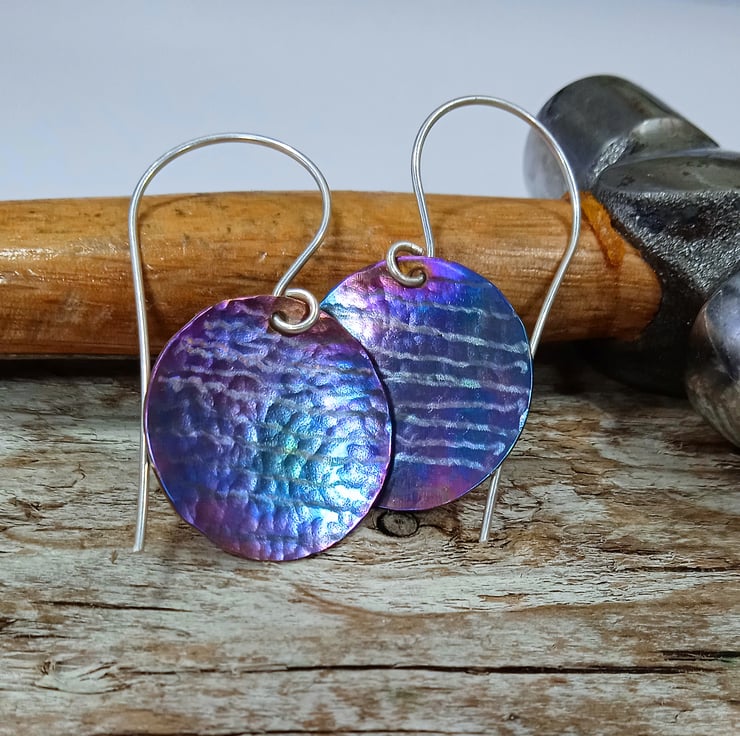 The titanium discs measure approximately 2.1 cm across and are hung from sterling silver earring wires which I have also hand made.