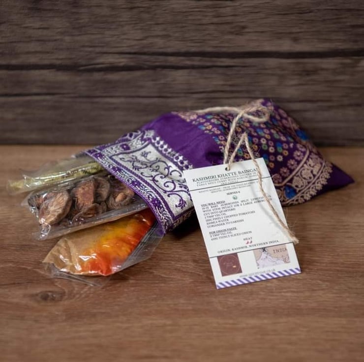 Our Kashmiri khatte baingan kits come in purple sari bags and provide all the spices you’ll need to create this exotic dish at home.