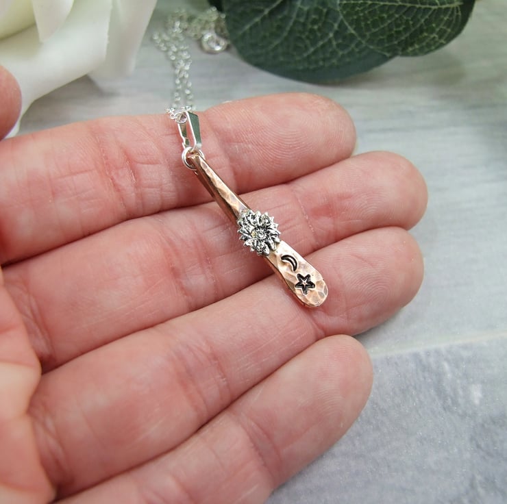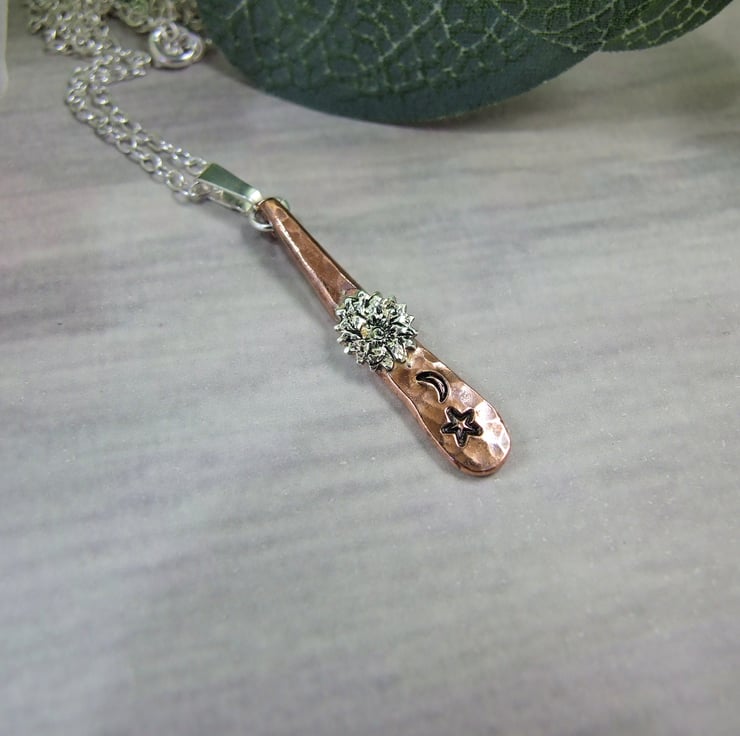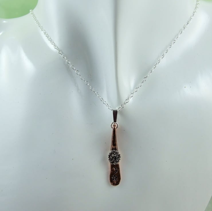 I have created the copper teardrop using 3.2mm thick copper wire happered into a teardrop shape and textured the surface. To this I have soldered on a tiny silver sun then hand stamped a little moon and star. Fitted to an 18 inch .925 Sterling Silver chain.