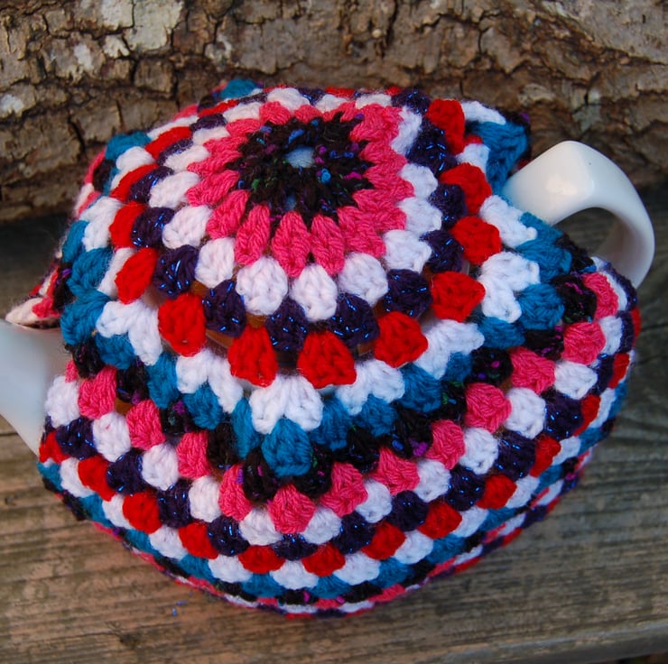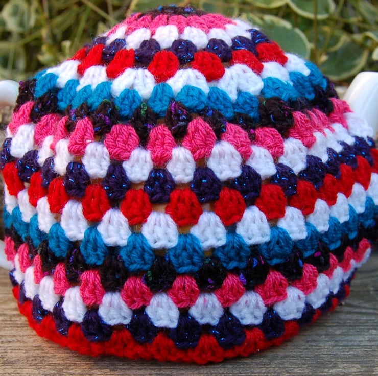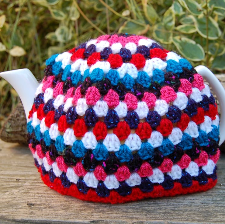 Each time I make this design of tea cosy the colours vary. You will receive the cosy shown in the photos.