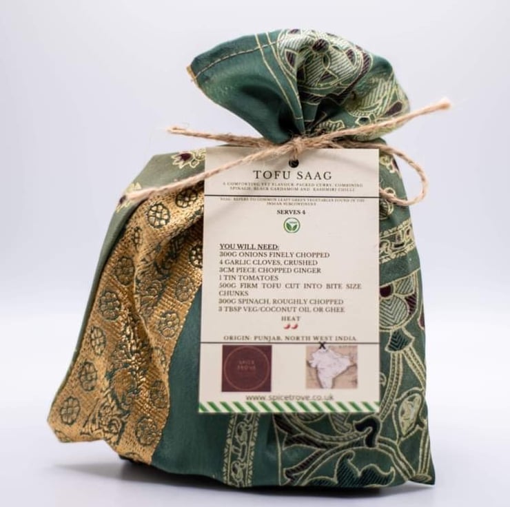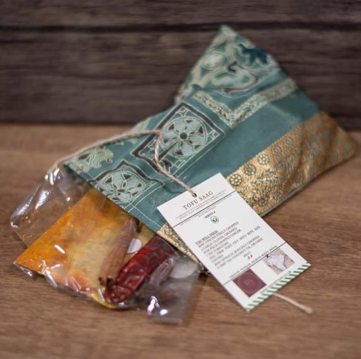 Our tofu saag kits come in green saree bags and provide all the spices you need to create this wonderful dish in 3 stages.