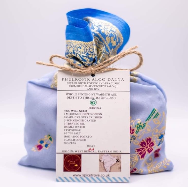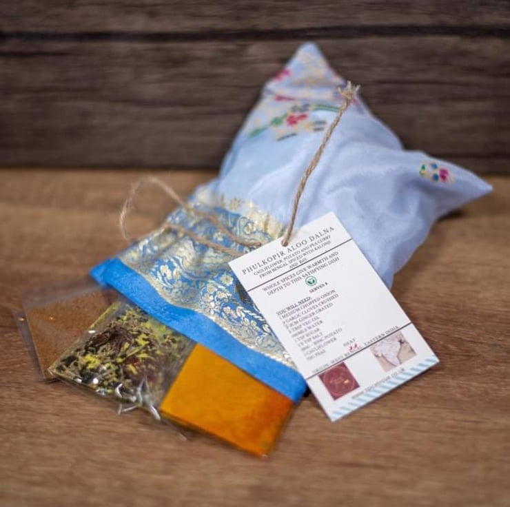 Our phulkopir aloo dalna kits come in light blue bags and provide all the spices required to create this wonderful dish at home.