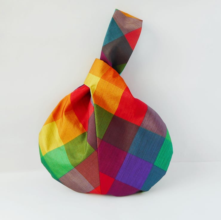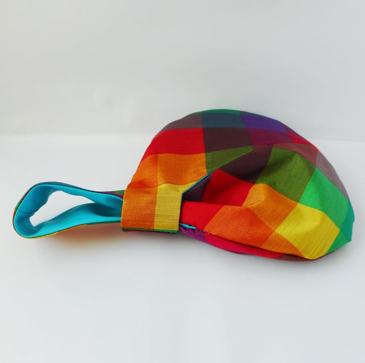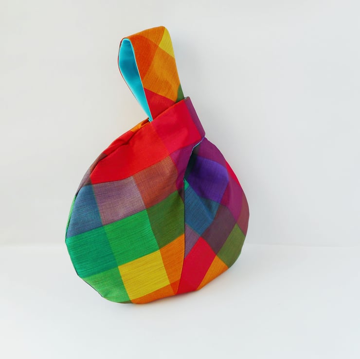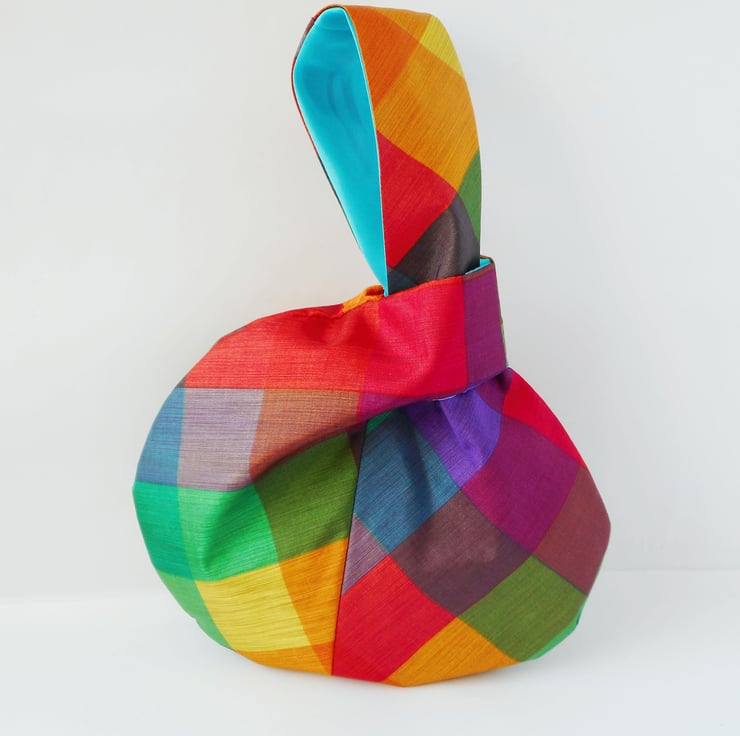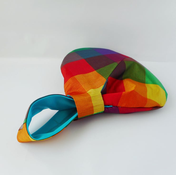 Hula is a silky little bag made in bright checks woven from rainbow brights. Fully lined in a gorgeous turquoise acetate lining fabric.