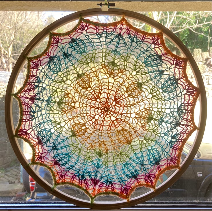 Bring a splash of colour and texture to your space with this breathtaking brioche mandala window hanging. This downloadable knitting pattern guides you through creating a radiant colourful mandala using brioche in the round, starting from the centre and expanding outward like a blooming flower.