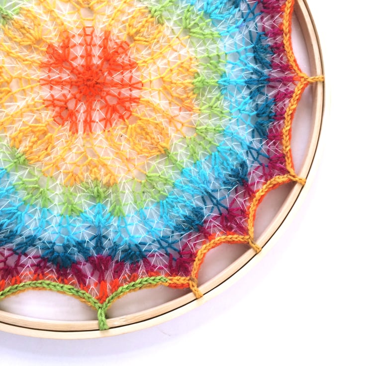 The finished piece is blocked and mounted in a 14” embroidery hoop, making it ready to hang wherever you need a touch of light, colour, and handmade charm.