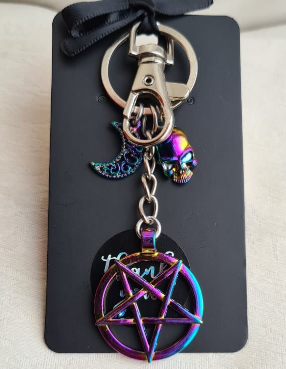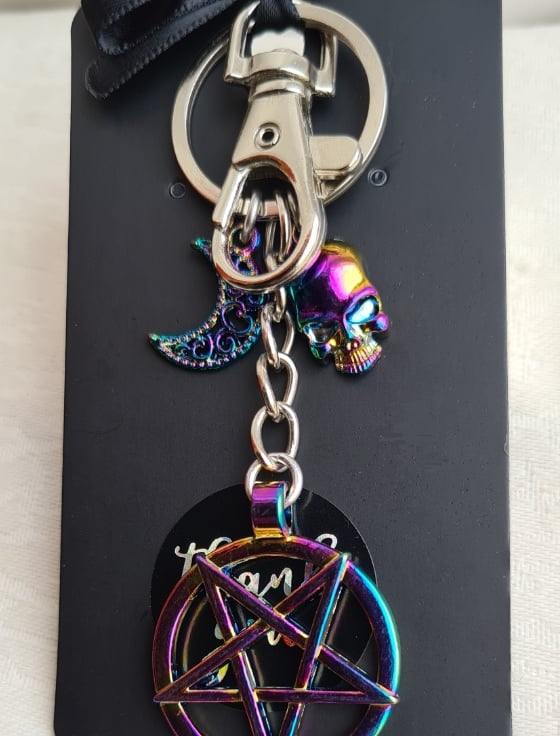 Key ring is approx 13cm long from the top of the swivel clasp to the bottom of the pentacle charm. Pentacle, Moon and Skull charms are a Rainbow or what I call an oil-slick tone.