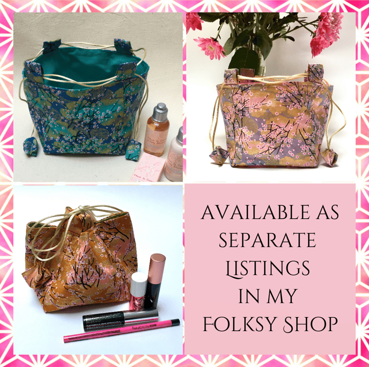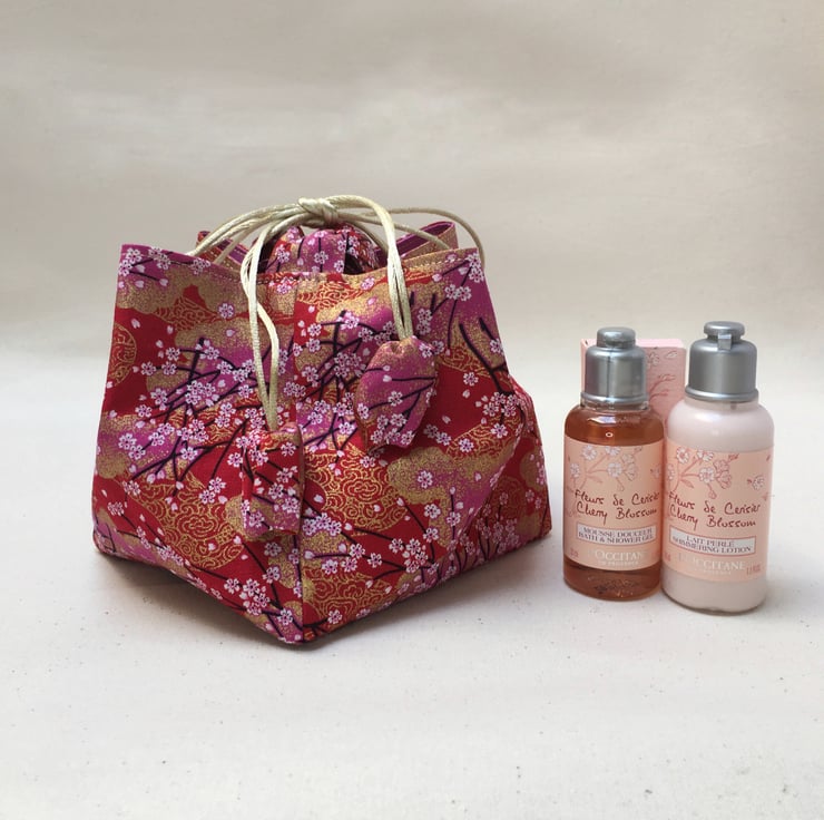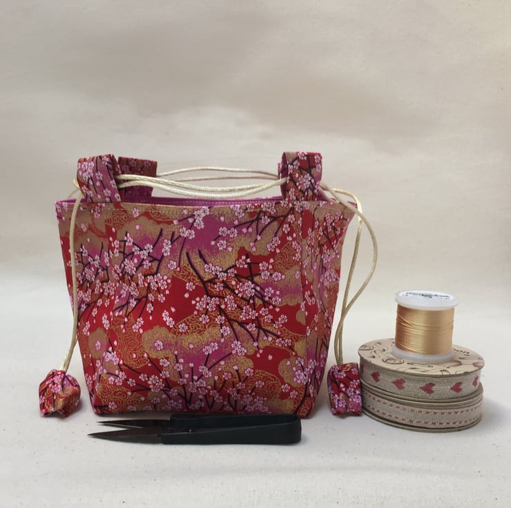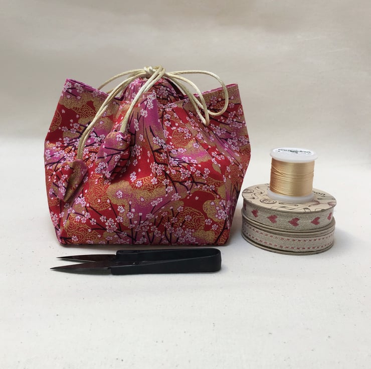 It measures approximately 12cm (4 1/2 inches) in height, width and depth. The Japanese fabric has been used to create the tabs to hold gold ribbon ties. The traditional flower tabs at the end of the ribbon have been crafted from Japanese fabric too.
