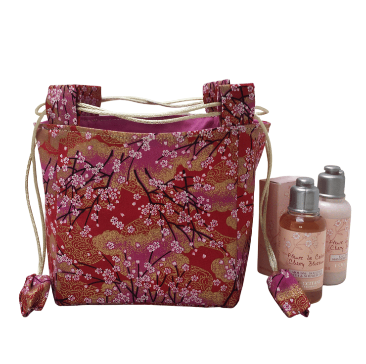 A gorgeous pink or cerise tiny blossoms fabric that is from Japan has been used to create this stunning gilded Japanese rice bag, or komebukuro, with a complimentary pink cotton fabric for the reverse.
