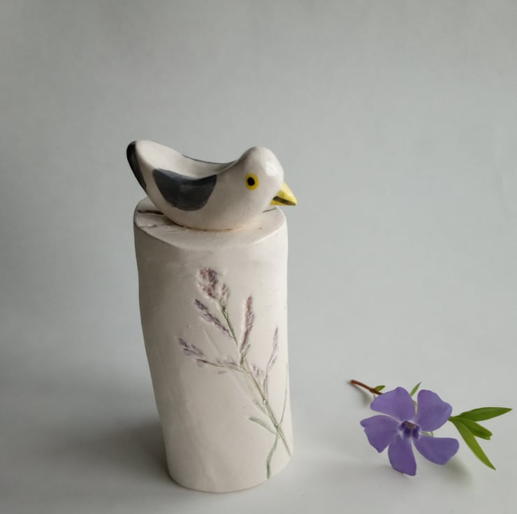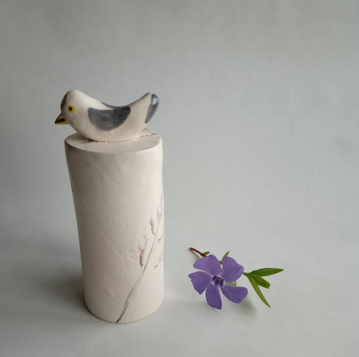 This is a cute seagull perched on to a ceramic plinth with flowers painted on.