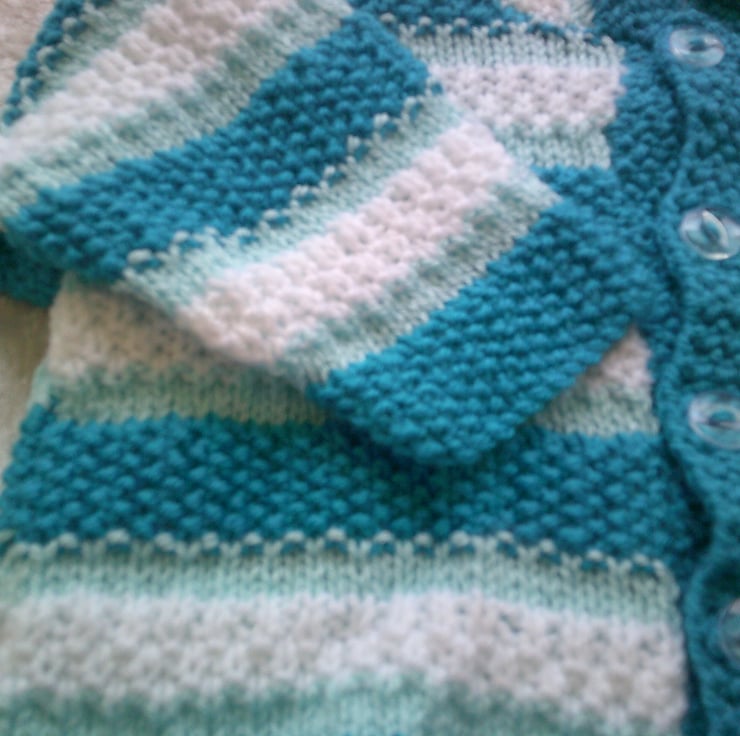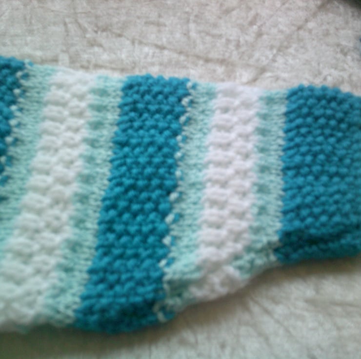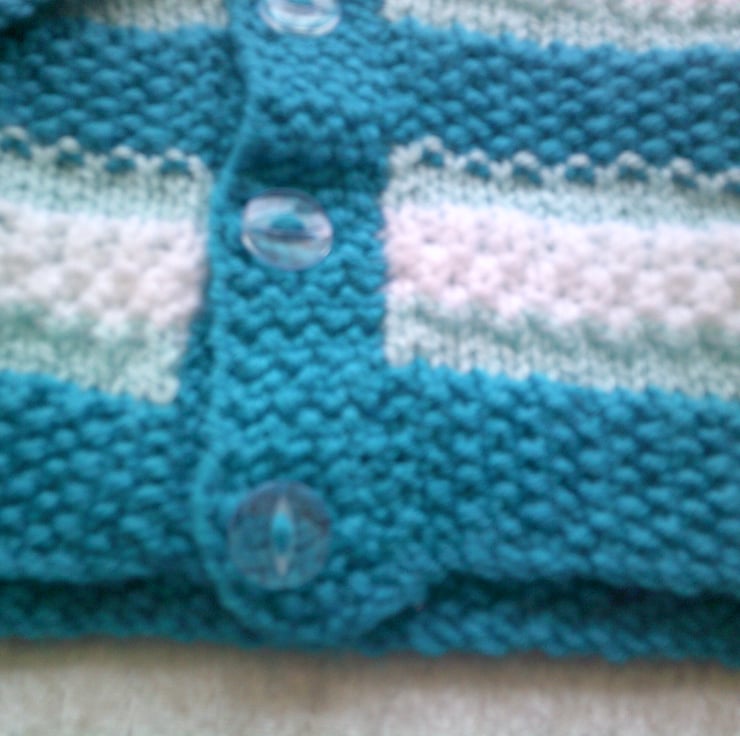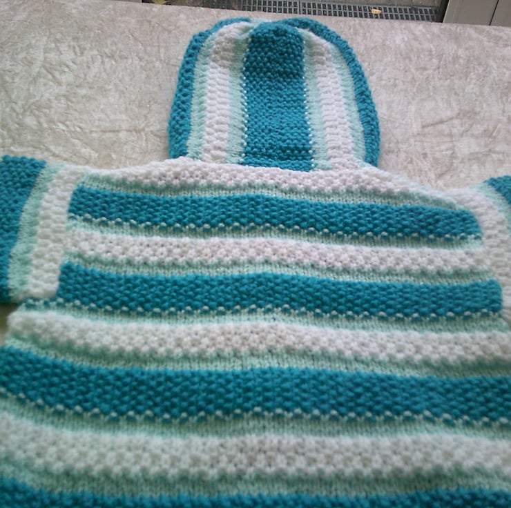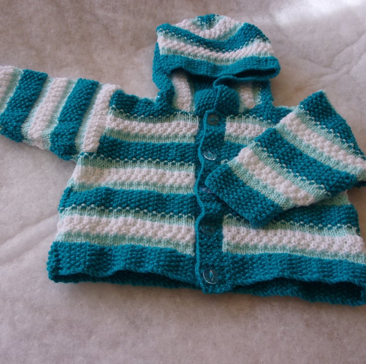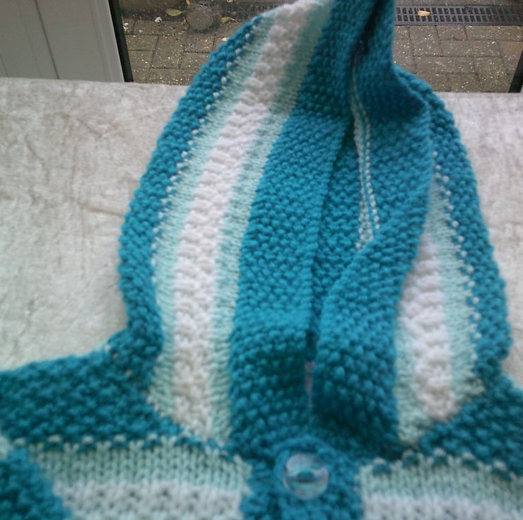 Hand knitted using acrylic yarn in shades of dark turquoise, light turquoise and white this hooded jacket would make an ideal additional to any child's wardrobe.