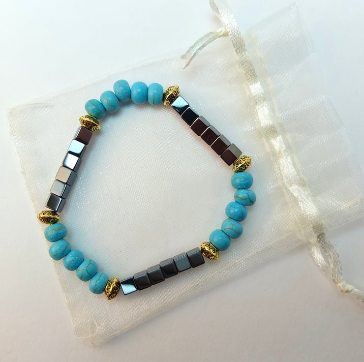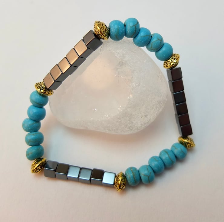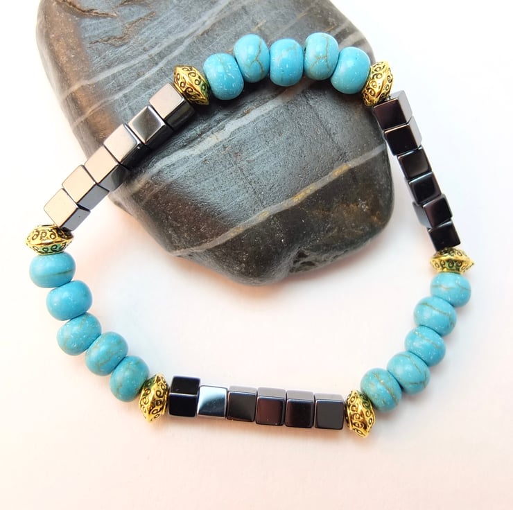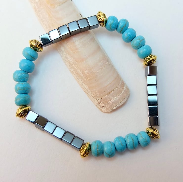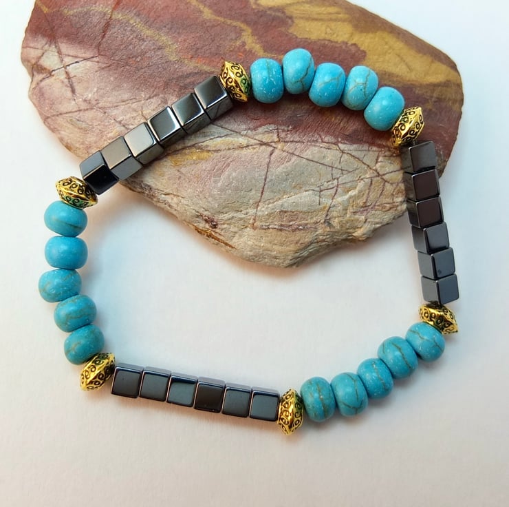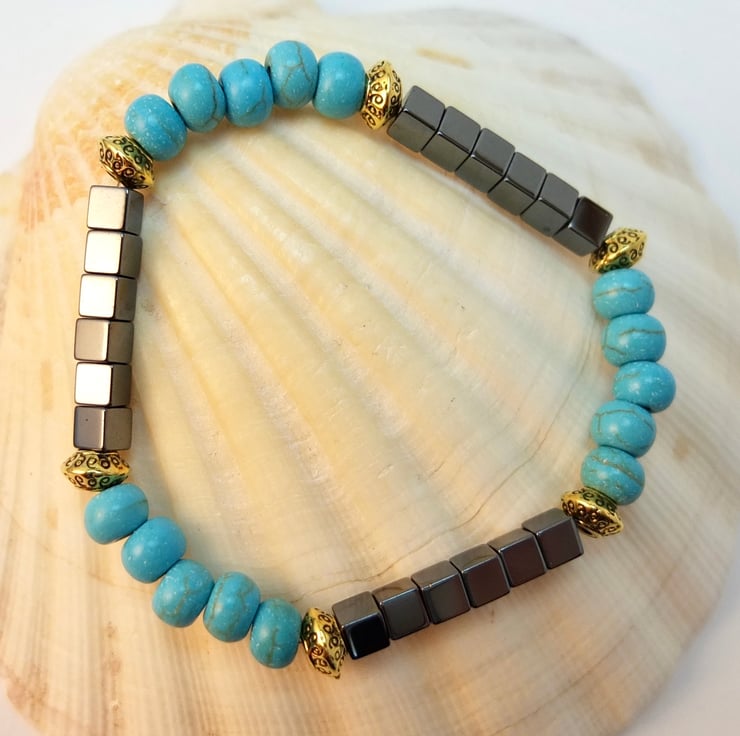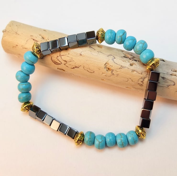 Simple but striking stretch bracelet of 6mm reconstituted turquoise rondelles and 4mm hematite cubes beads.