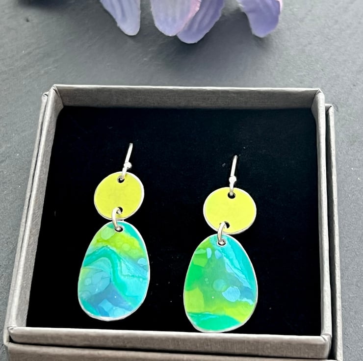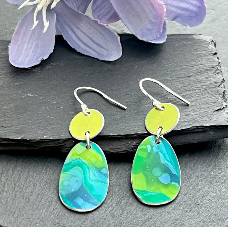 Hand painted and hand crafted Aluminium/sterling silver drop earrings.