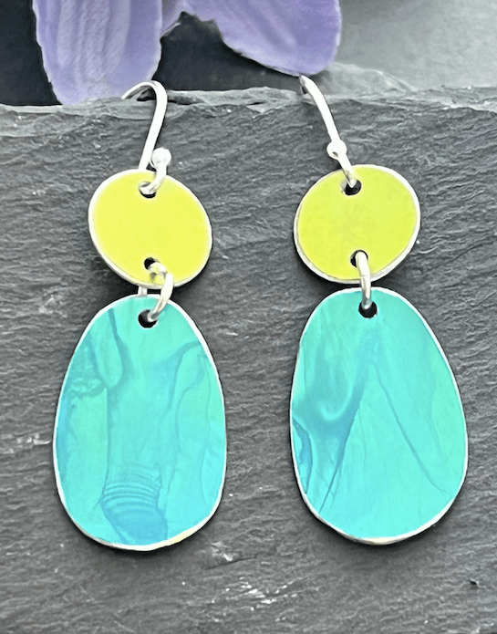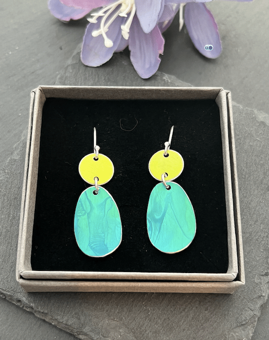 All my aluminium jewellery is inspired by one thing, my love of colour! I love to find ways of introducing colour into my work especially hand dyed methods. Each sheet of aluminium I print and dye is unique due to the process. Elements of each dyed panel are then selected and incorporated into my designs.