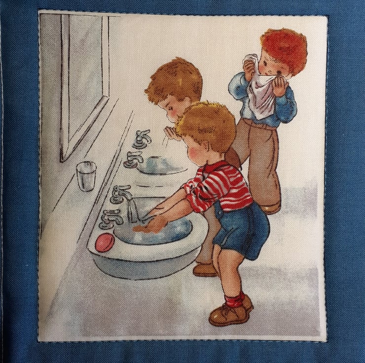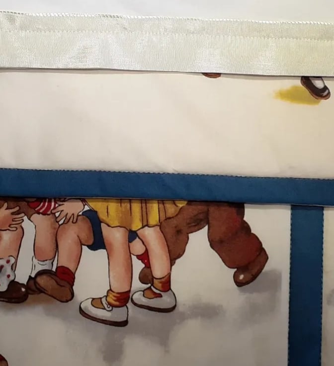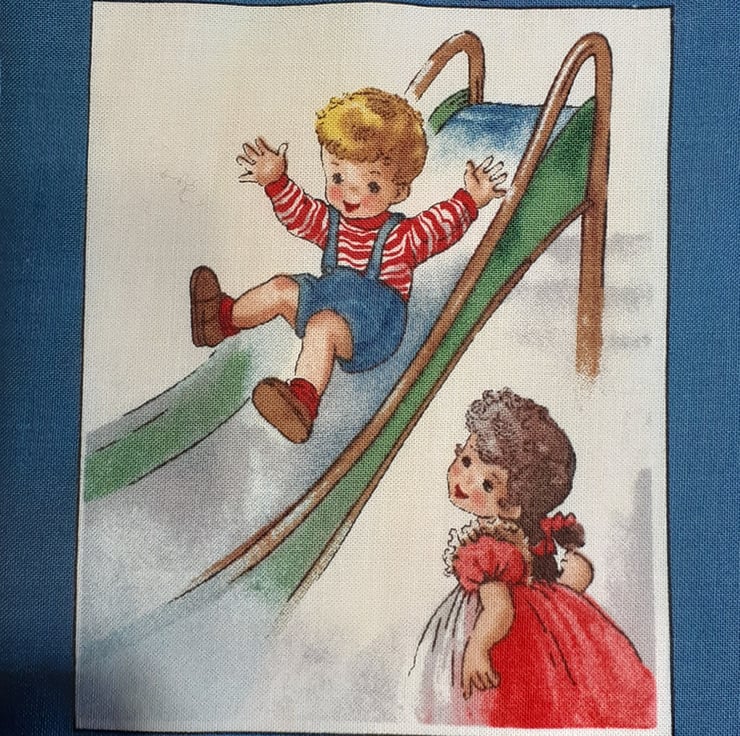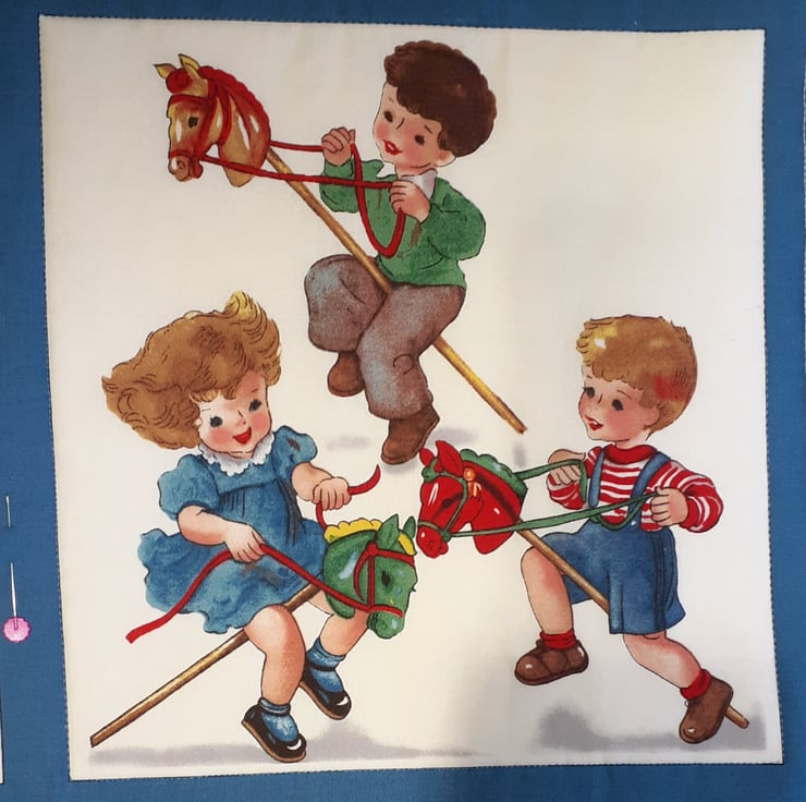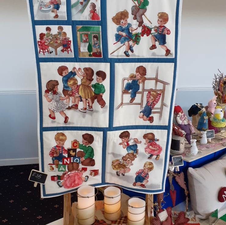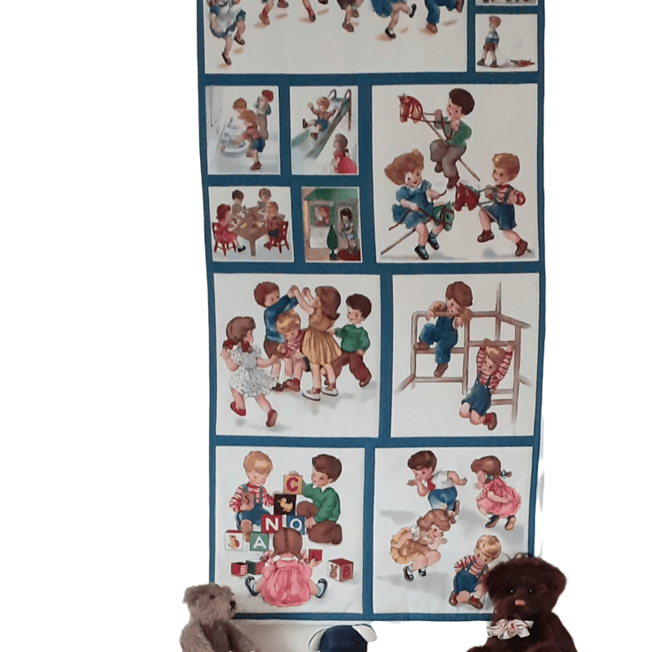 This gorgeous wall hanging with children playing games from days gone by will look beautiful hung on the wall of a nursery or a child's bedroom. Do you remember skipping, playing tag, riding your hobby horse, building wooden blocks, and so many more. A beautiful panel which I've backed with lovely cotton and a satin ribbon for ease of hanging in a nursery or child's bedroom. A charming keepsake for handing down to the family.