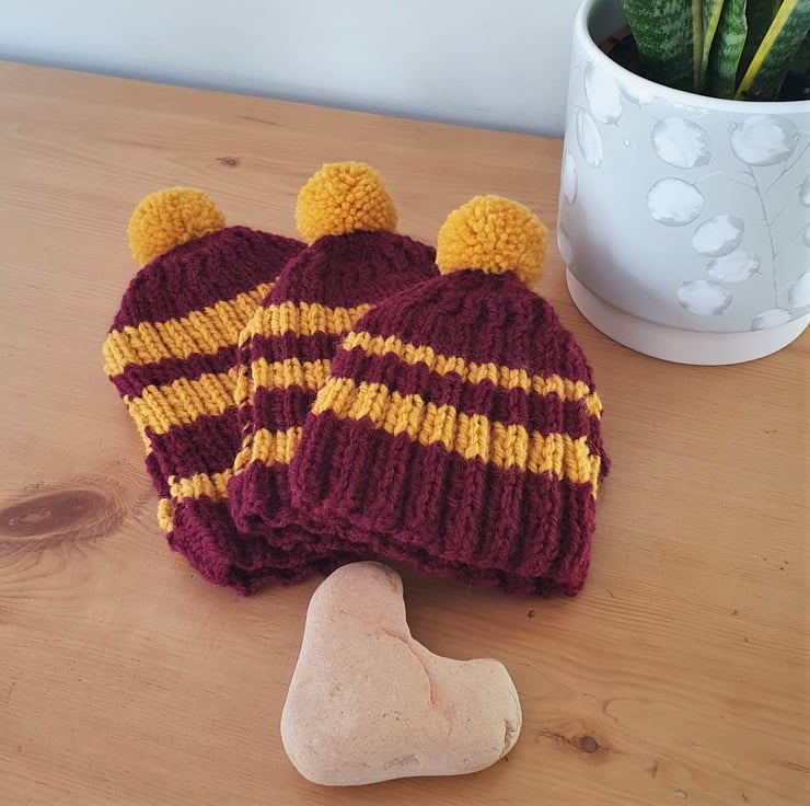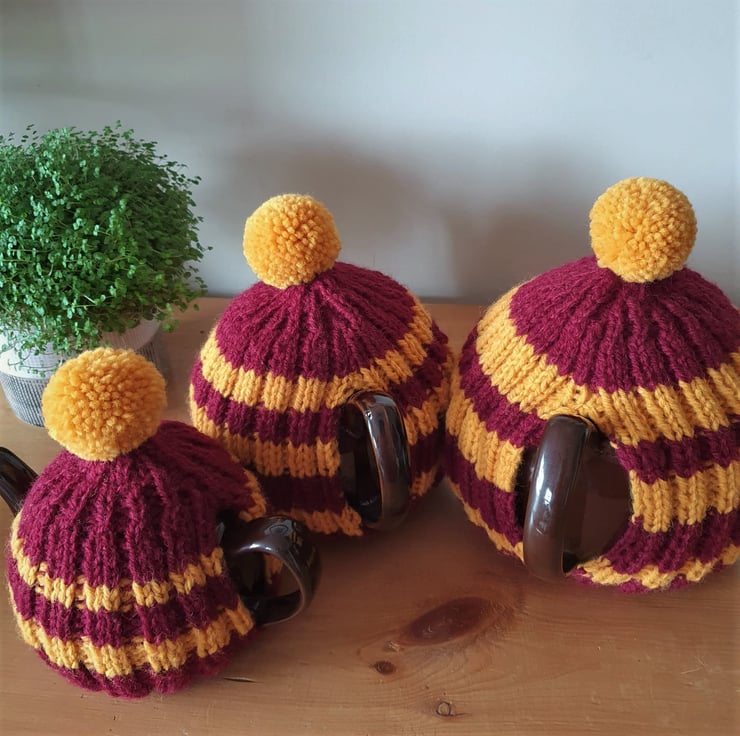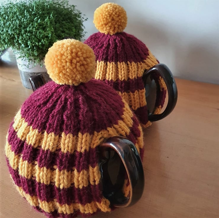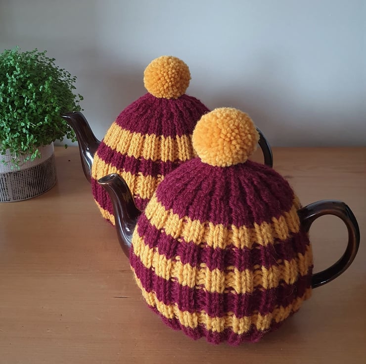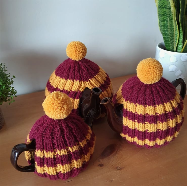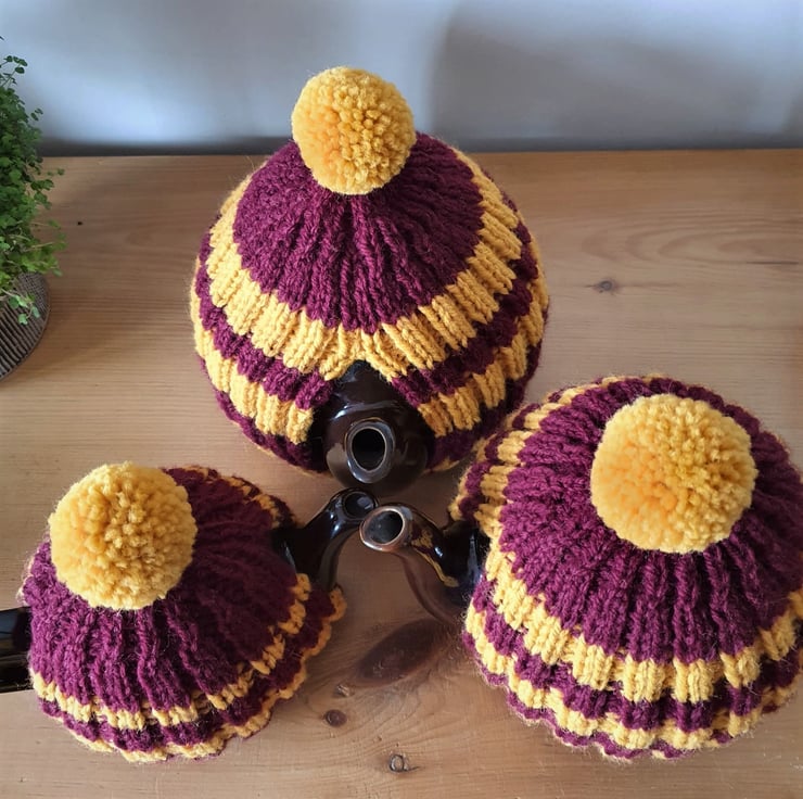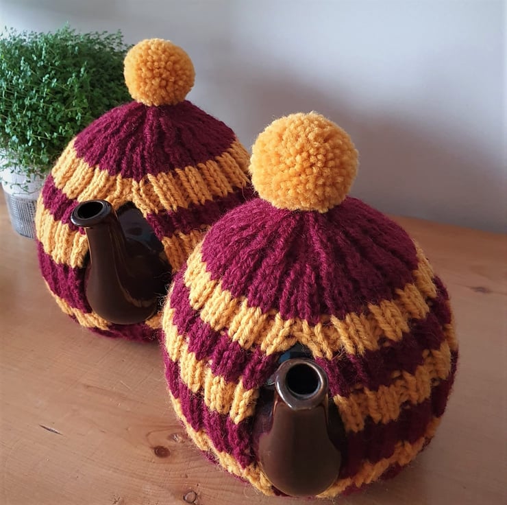 Medium Tea Cosy for 6 Cup Tea Pot, Dark Red & Gold Striped, Hand Knitted