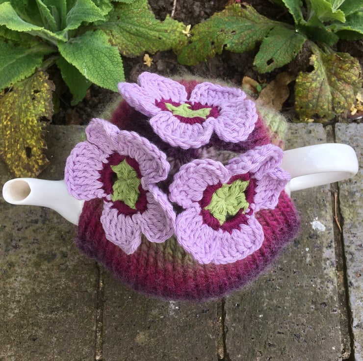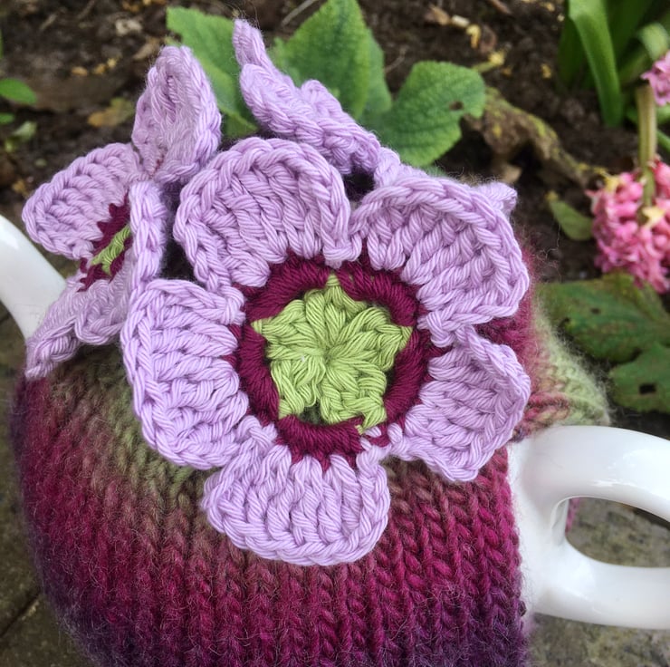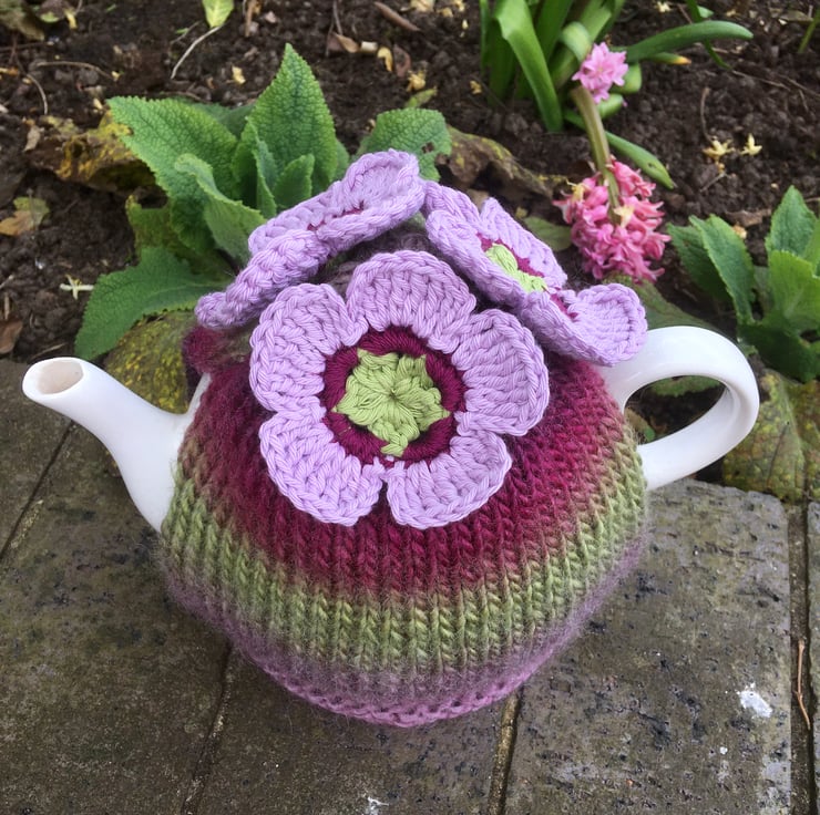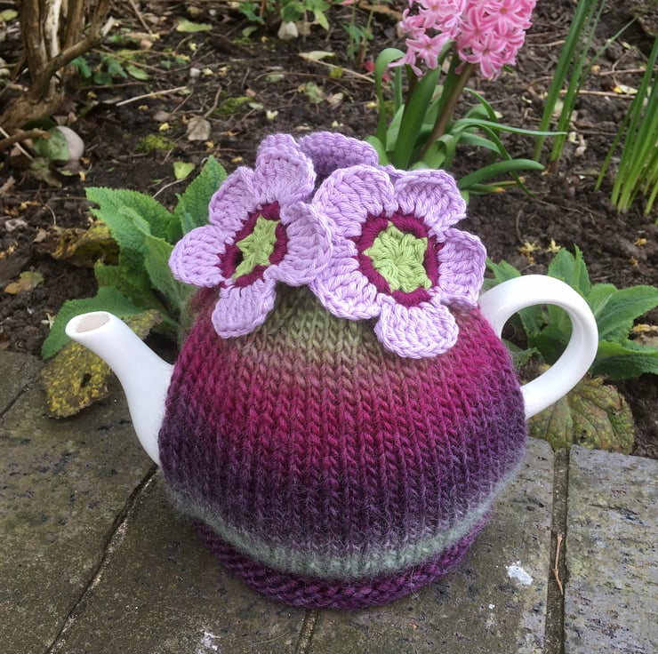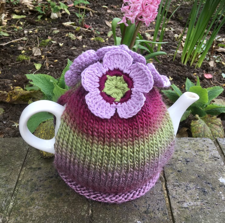 I have hand knitted this large tea cosy using a warm and chunky wool mix yarn that fades from colour to colour. The shades are plum, magenta, pale pink, grey and green. There are three crochet flowers attached in shades of lime green, dark pink and pale pink. The flowers are made using 100% cotton yarn.