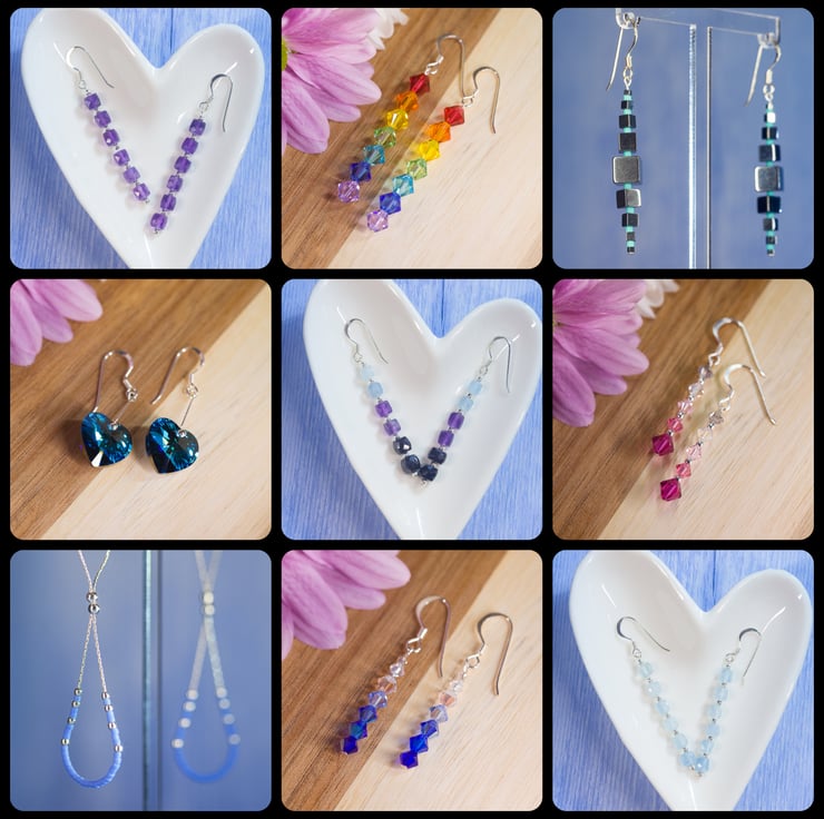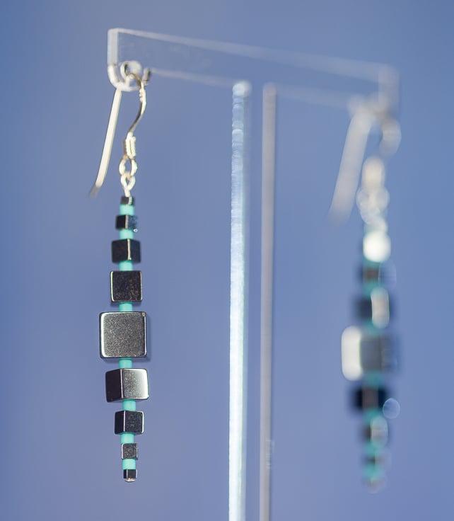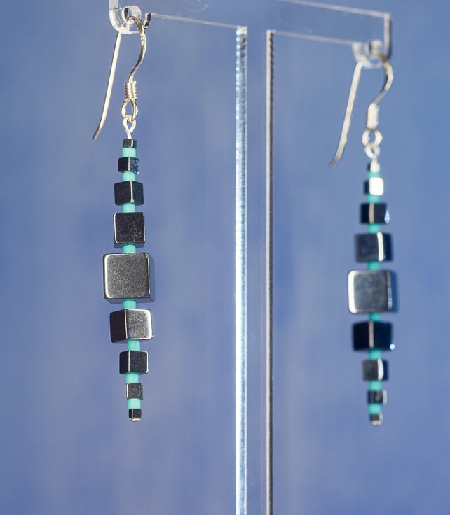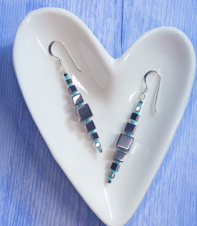 We have made these unique earrings using Hematite cubes in various sizes and to add some colour, we have included turquoise seed beads. They are attached to sterling silver ear wires (for pierced ears) and measure approx 5.5cm.