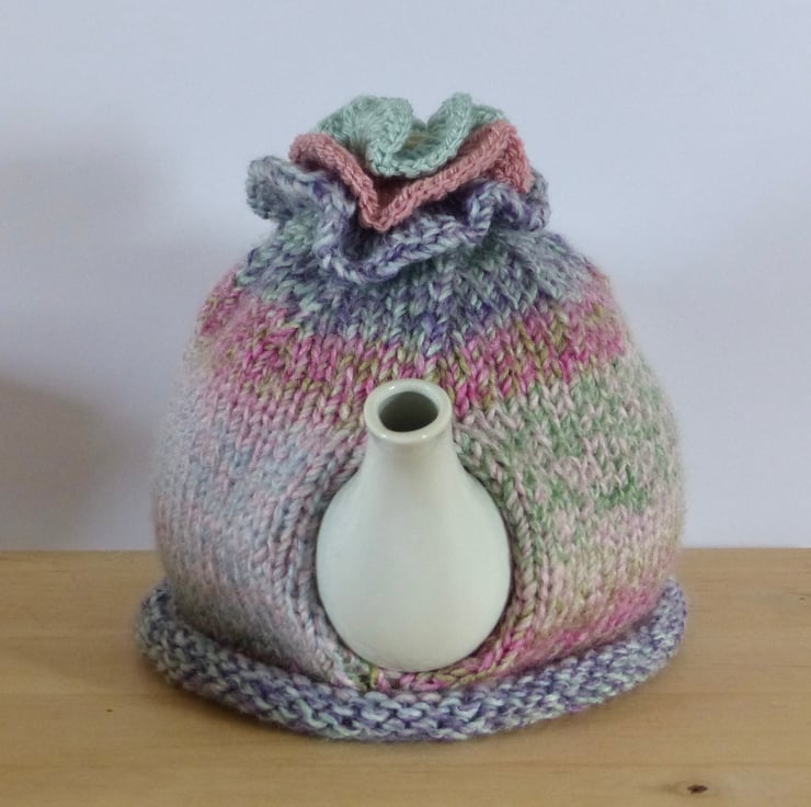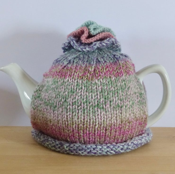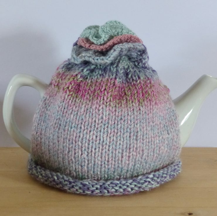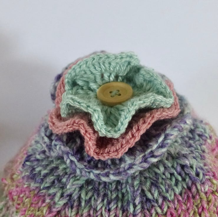 A hand knitted Tea Cosy in a chunky variegated yarn in pretty pastel shades - Pink, Purple, Blue and Green. It is topped with a triple layer flower - the outer layer is the same yarn as the cosy, the middle layer is Vintage Pink and the inner layer is Duck Egg and it has a natural wood button in the centre.