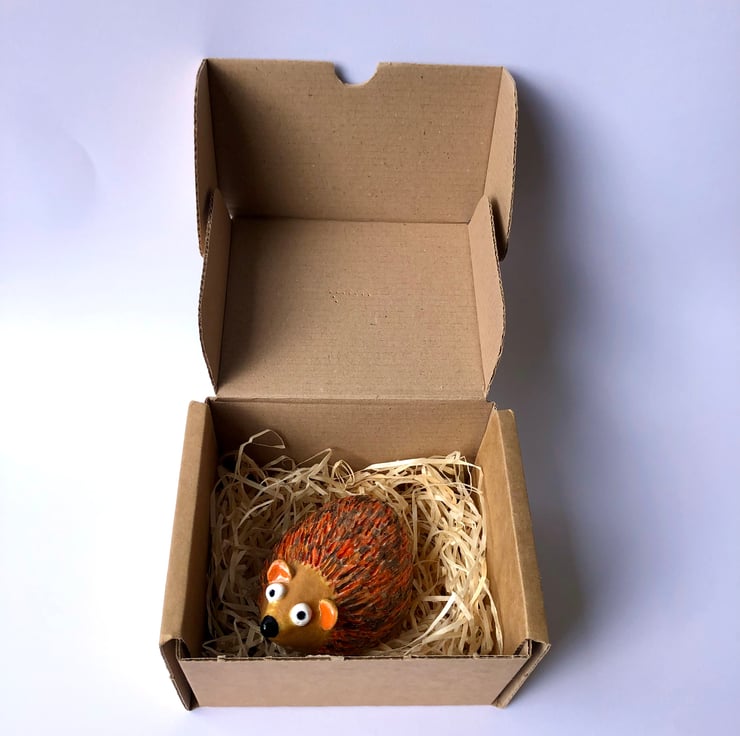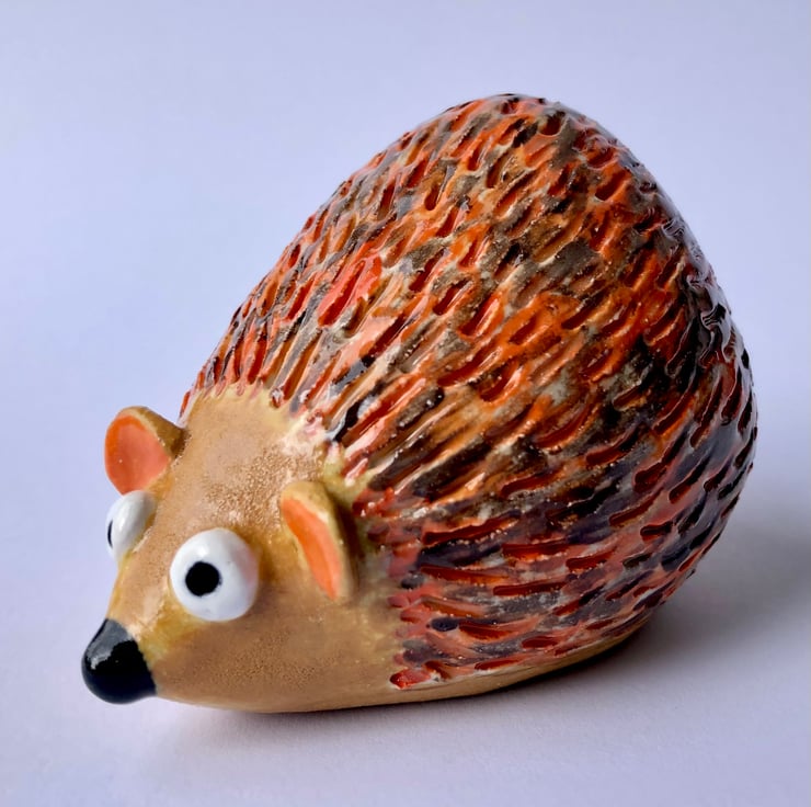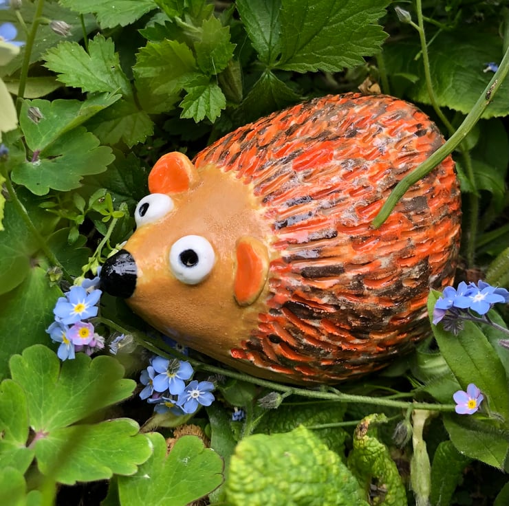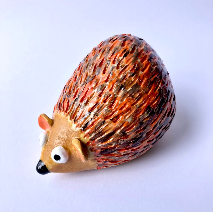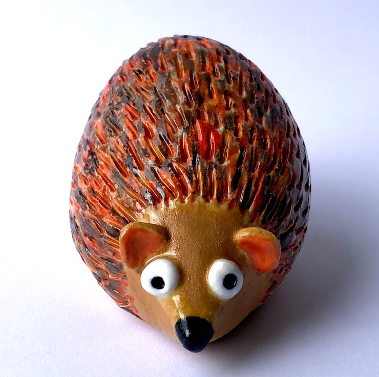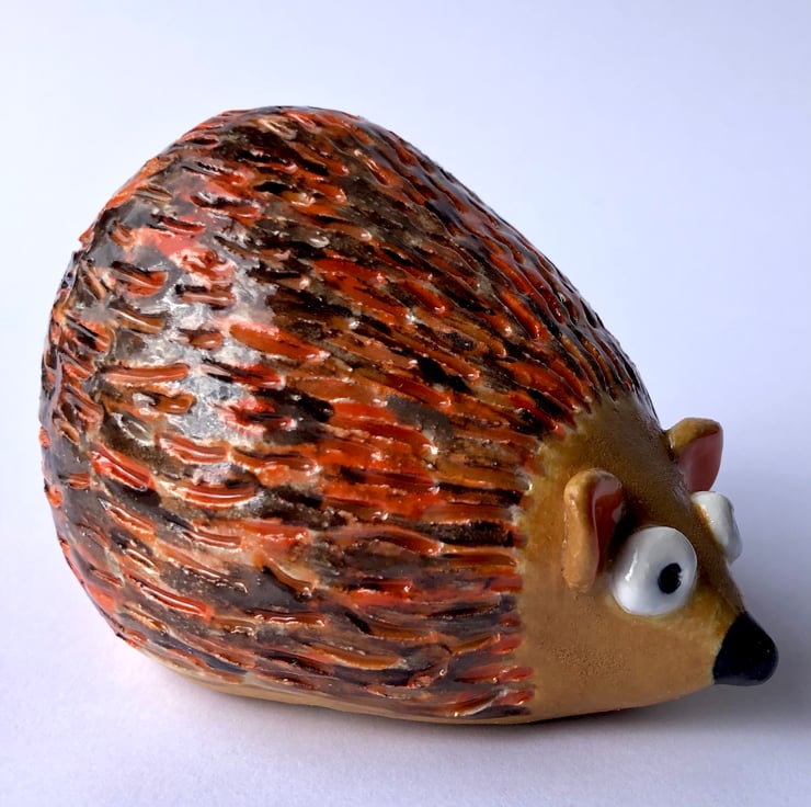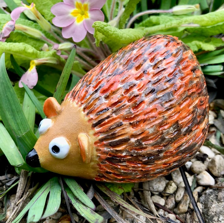 Suitable for indoors or out, this stoneware ceramic hedgehog is approximately 9cm long and glazed in some lovely warm orange and browns. I handbuild these little creatures from white clay in my pottery studio at the bottom of the garden and then fire them in the kiln shed.