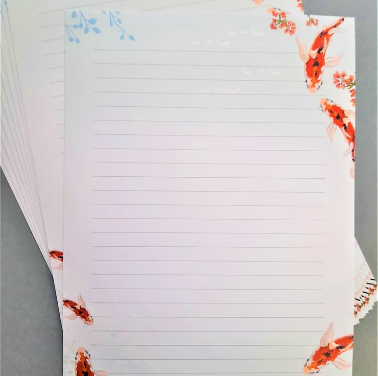 A set of 10 sheets of A5 size handmade letter writing / notepaper set with a beautiful koi carp theme.