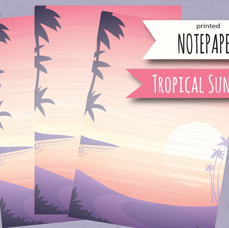 A set of 10 sheets of A5 size handmade letter writing / notepaper set with a colourful tropical sunset theme.