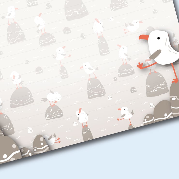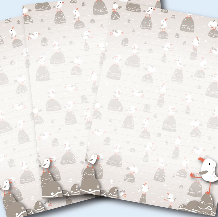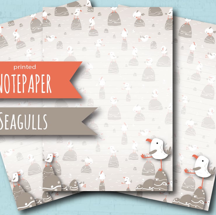A set of 10 sheets of A5 size handmade letter writing / notepaper set with a cute seagulls theme.