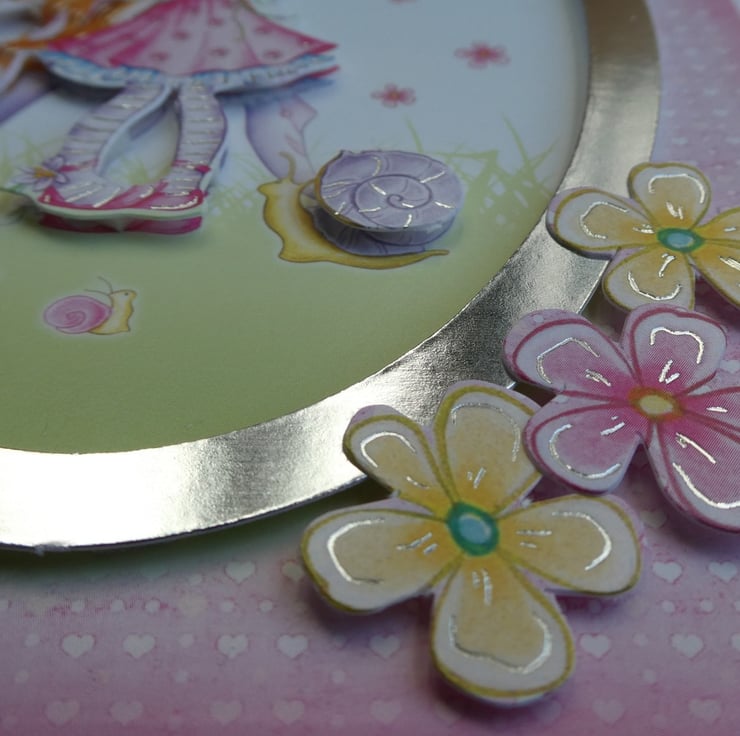 This pretty card has a background of tiny hearts on pink card with a picture of a fairy (or little girl wearing fairy wings) in the centre. The image has been decoupaged to raise it up from the card base.