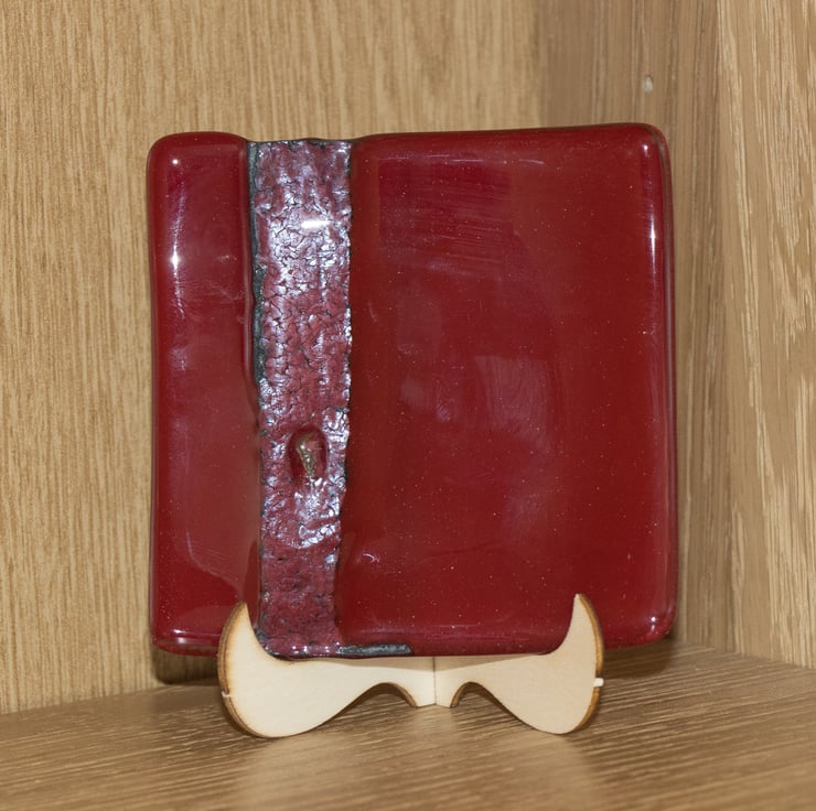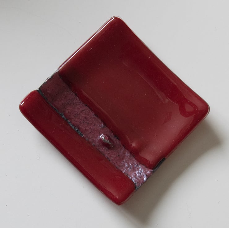 This particular design has a strip of iridised and textured glass running through the red base. This has a sparkling bubble of glass in it.