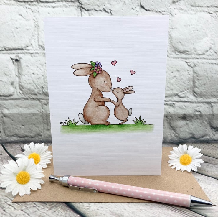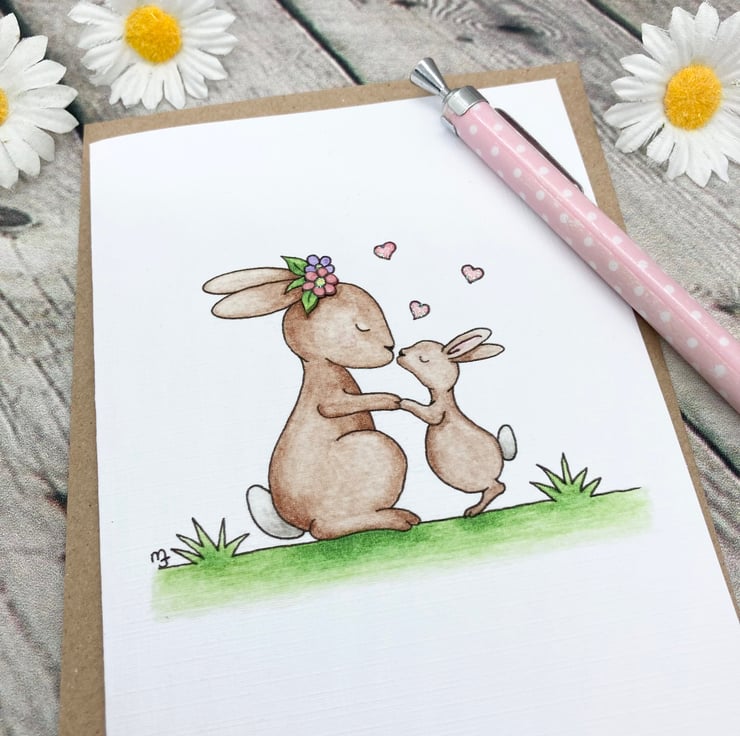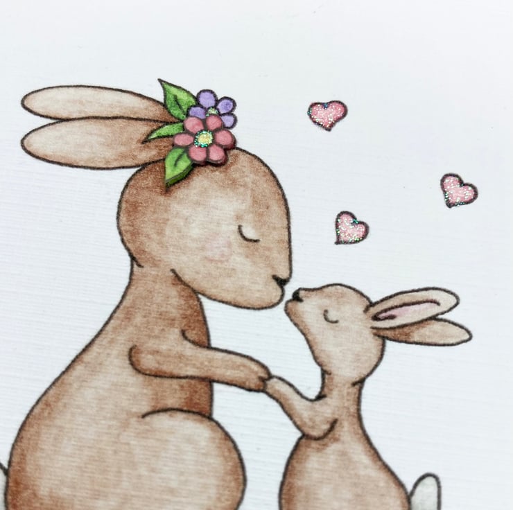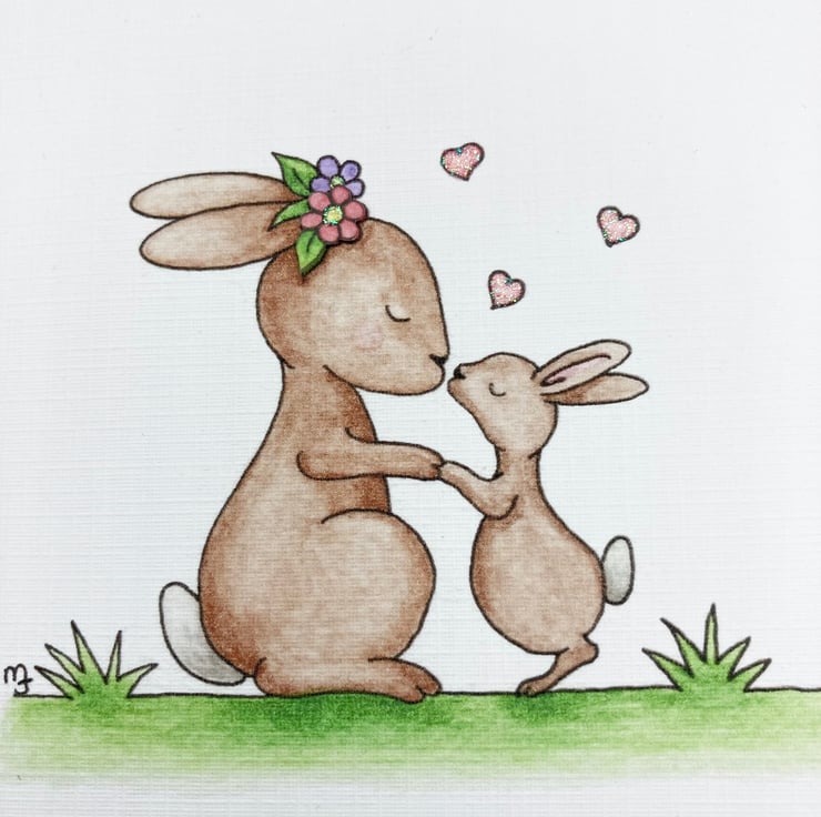 This cute Mother & Baby Bunny card has been designed using my own original illustration. The image has been printed out onto good quality white linen embossed card and decoupaged up in parts. I have also added a little glitter detail.
