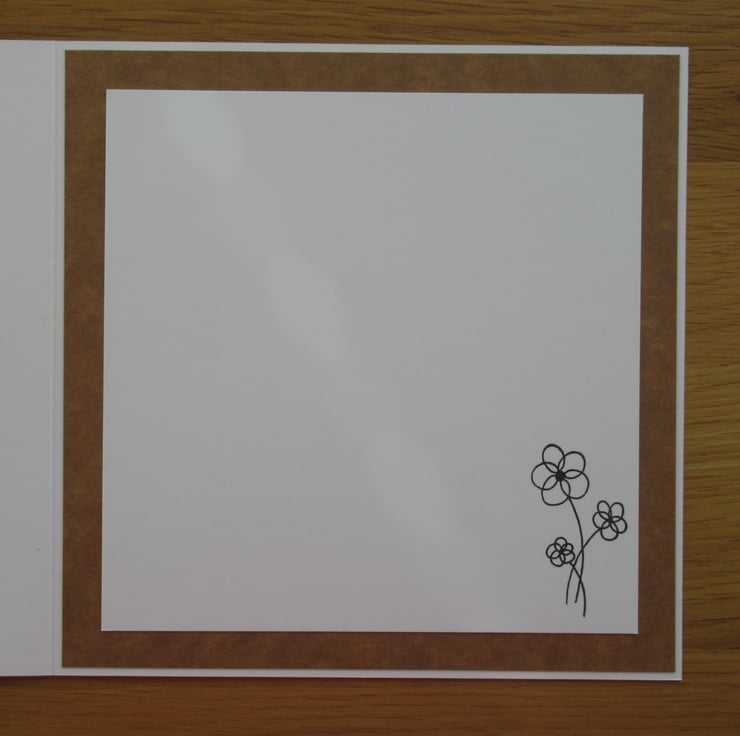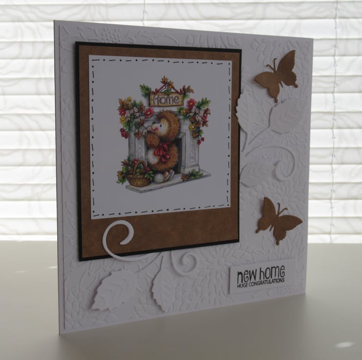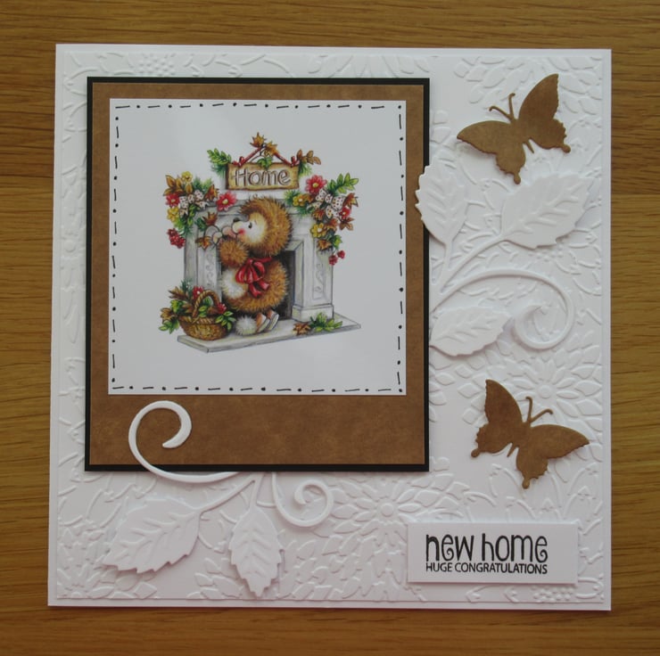 This pretty card features the image of a cute hedgehog by the fireplace which has a 'Home' placque placed above it. The square image has been mounted onto bown card to give the effect of a polaroid picture and the card is decorated with foliage and butterflies which have been die cut by me. The background card has been embossed for texture and the embellishments are raised in places for added depth. The inside has been finished to coordinate but has been left blank for your own message.