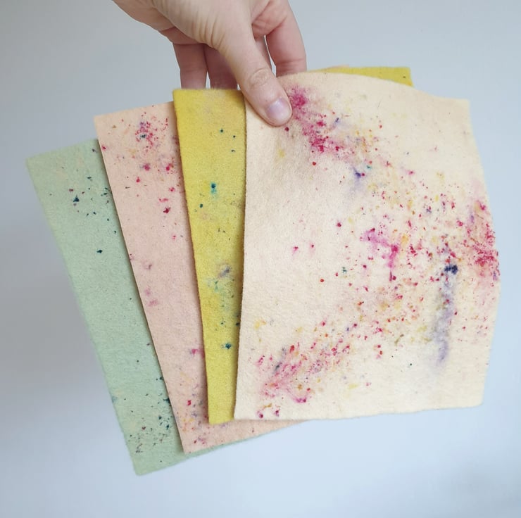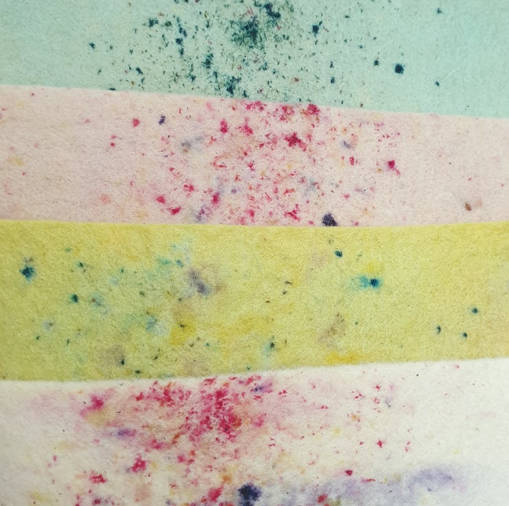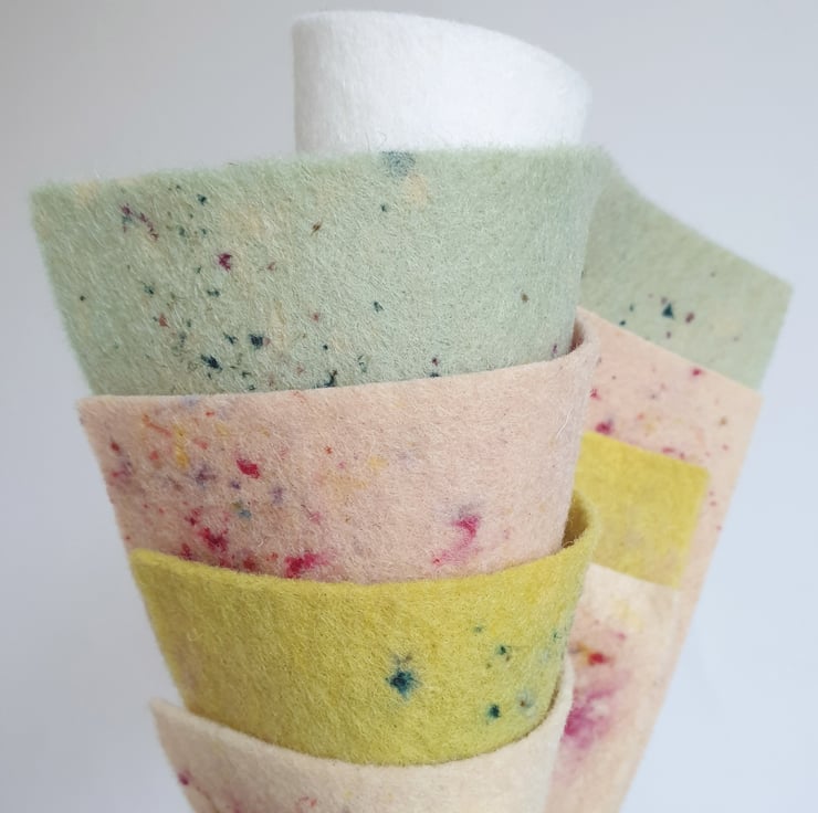 Dyed on base colours made from dyer's chamomile, apple leaf and avocado, speckles of madder, cochineal, weld, hibiscus and indigo create mini springtime galaxies that dance across the felt.