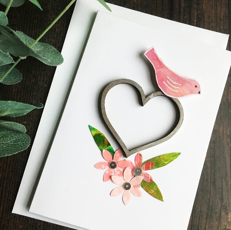 The matching card has a pale pink bird painted with acrylic and mounted on mdf so that it appears to perch on top of the heart which has been given a coat of silver wax gilt. The flowers are made from origami papers and have silver sequin centres.