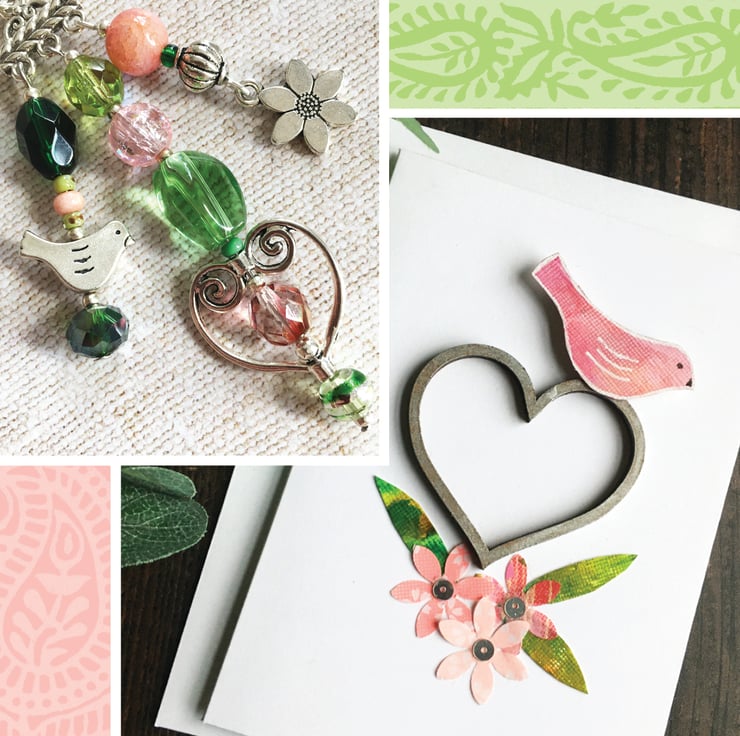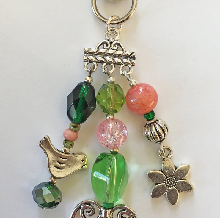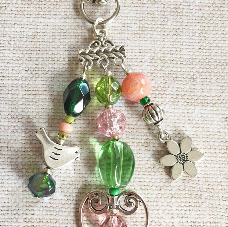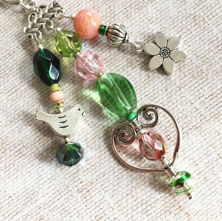 A little silver-tone bird, flower and open heart charm are nestled among a selection of glass beads in shades of green and soft pinks. The beads include crackle glass, drawbench and Czech fire-polished. I've also used a selection of seed beads to act as spacers.